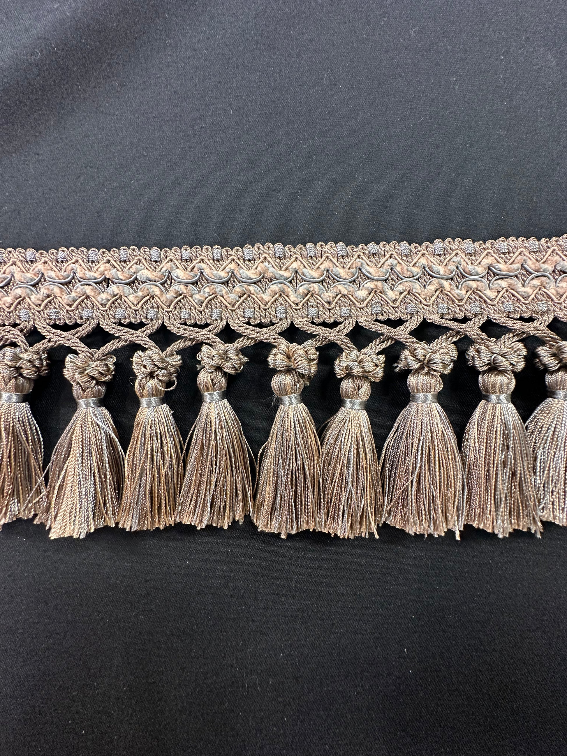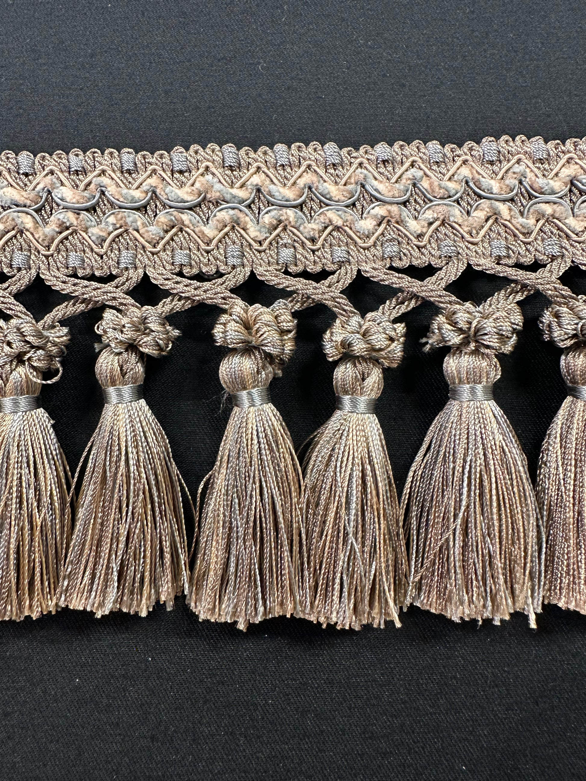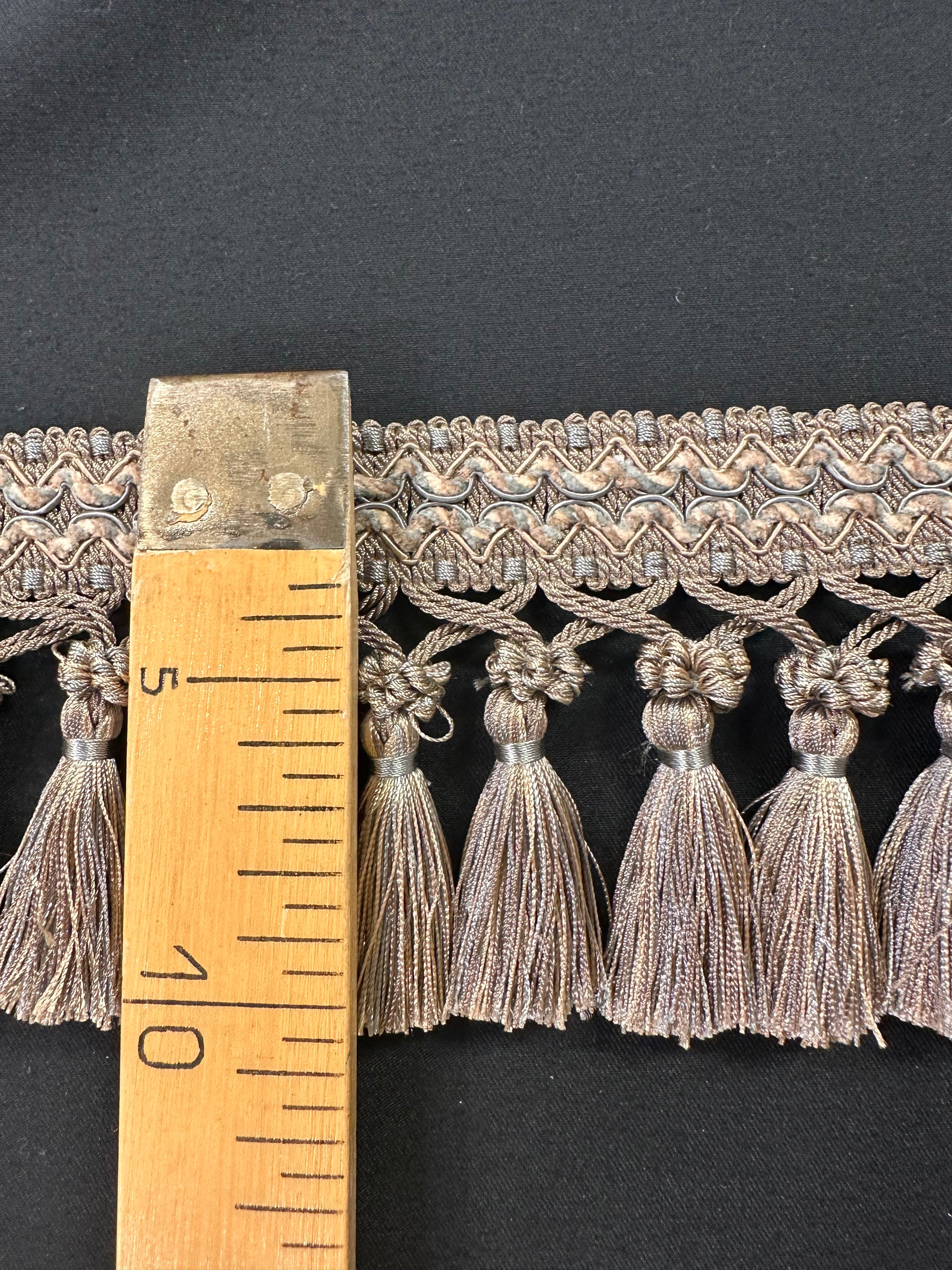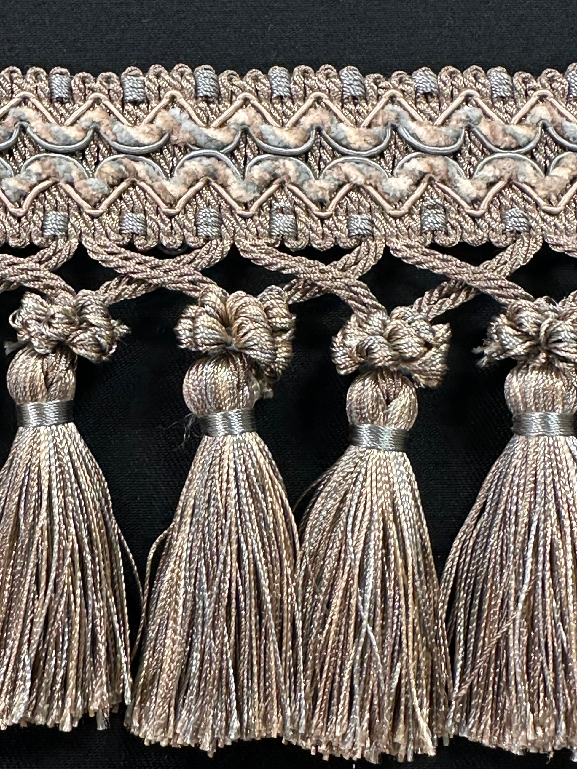Tupsullinen sisustusnauha somisteeksi verhoihin, tyynyihin yms. Tupsujen väreissä hennon siniharmaata ja kullanväristä lankaa.