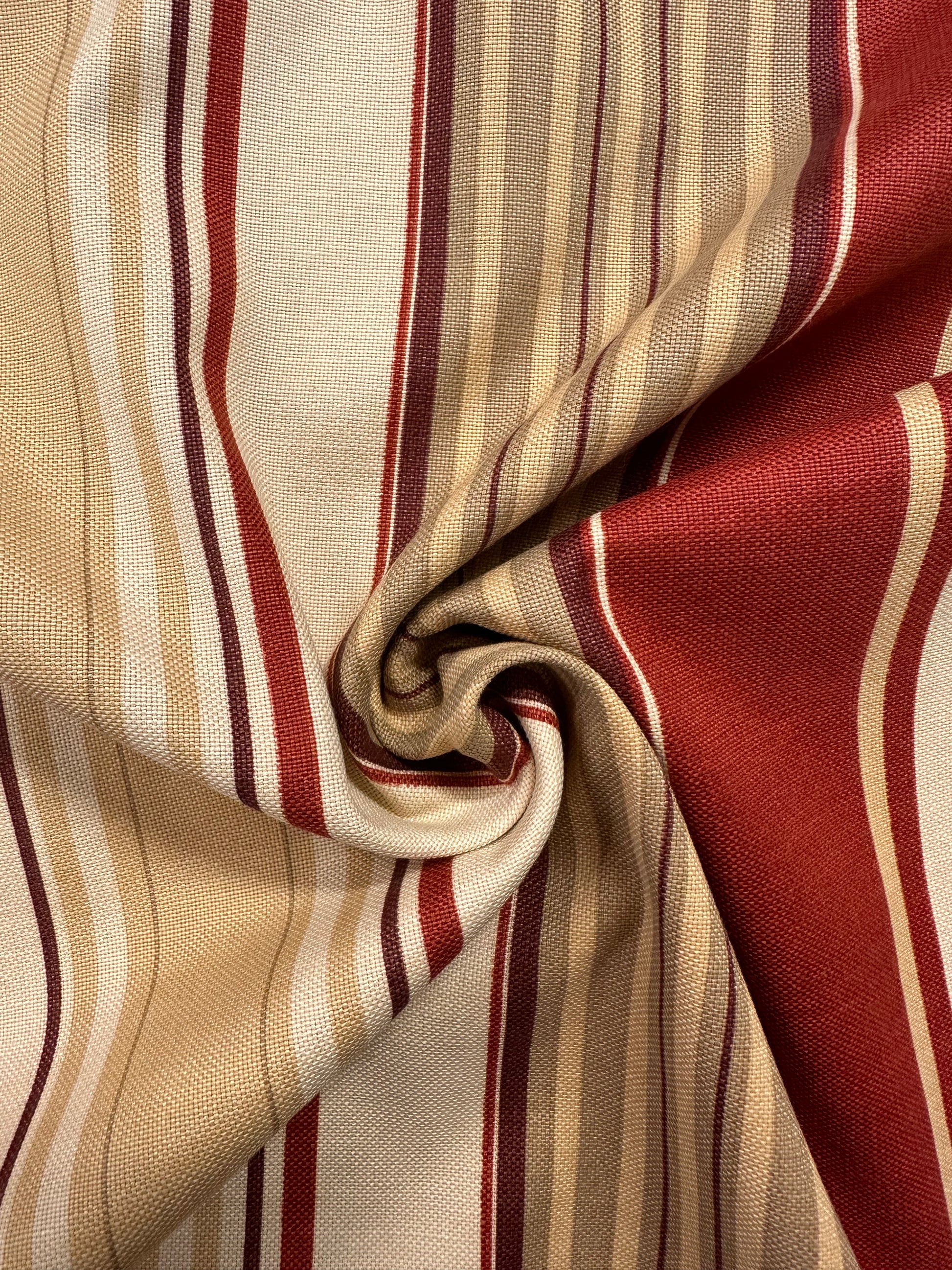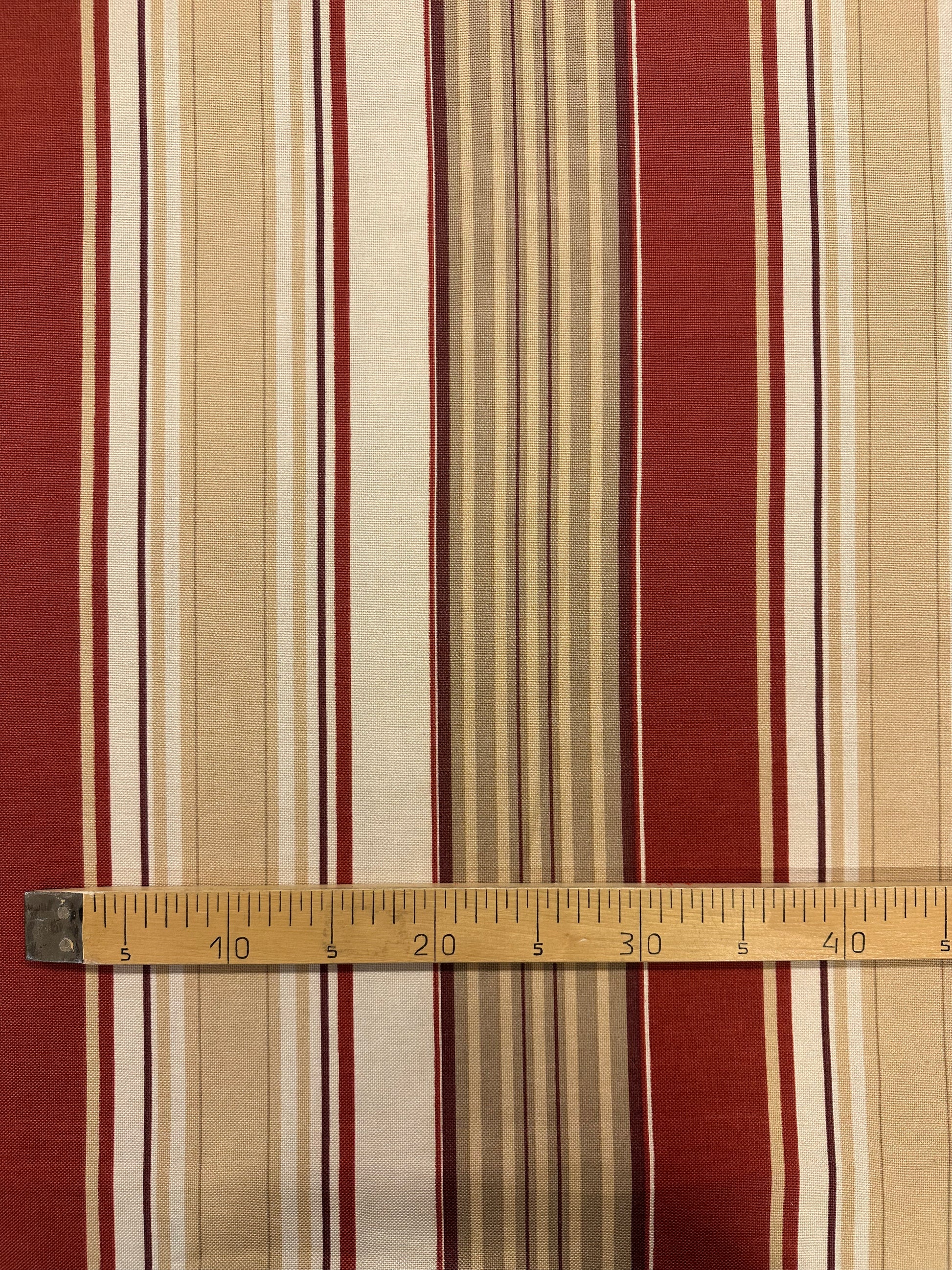 Tämä kangas sopii hyvin esimerkiksi verhoihin, tyynynpäällisiin, pöytäliinoihin tai kangaskasseihin. Kankaassa olevat raidat painettu.