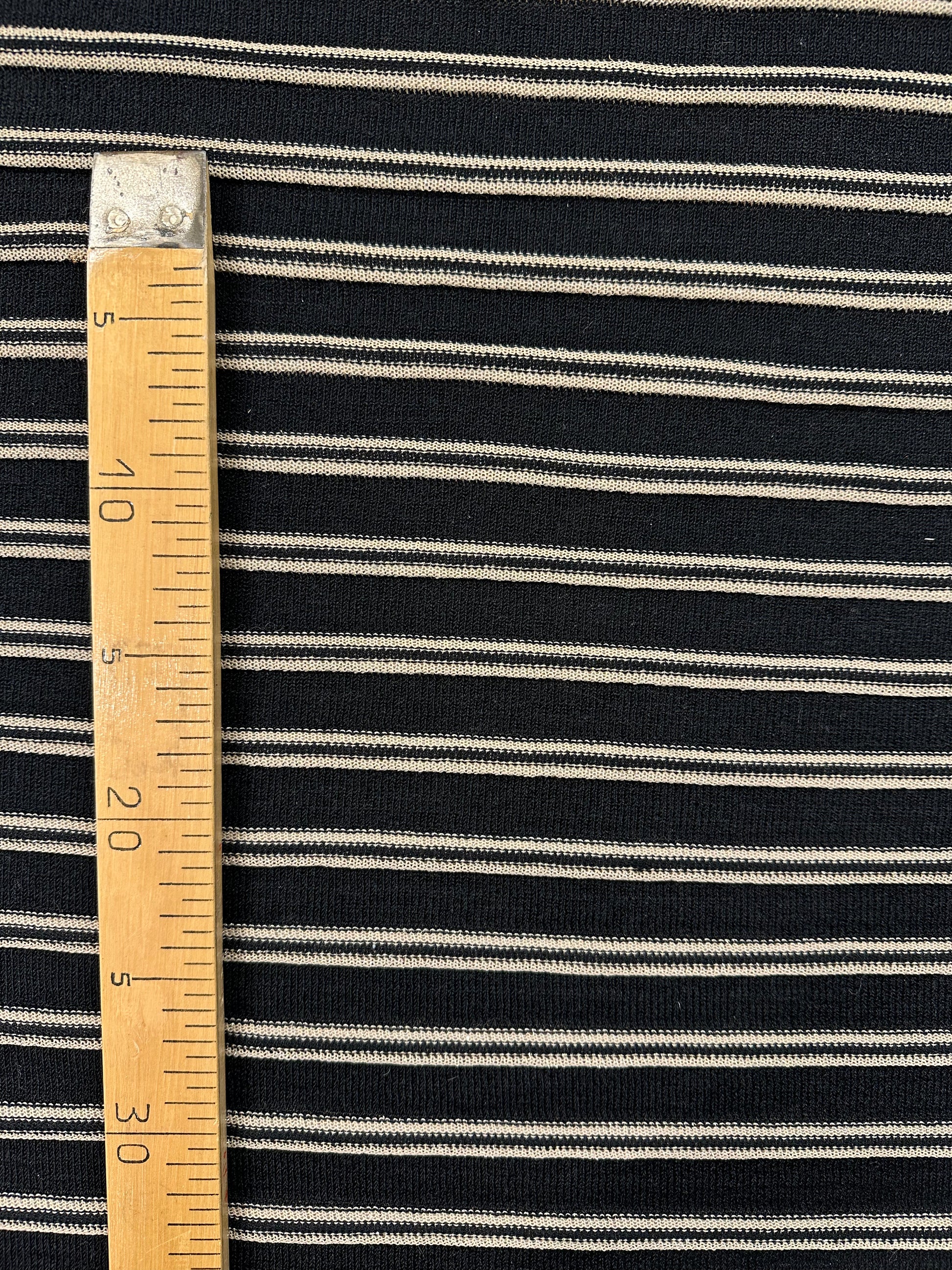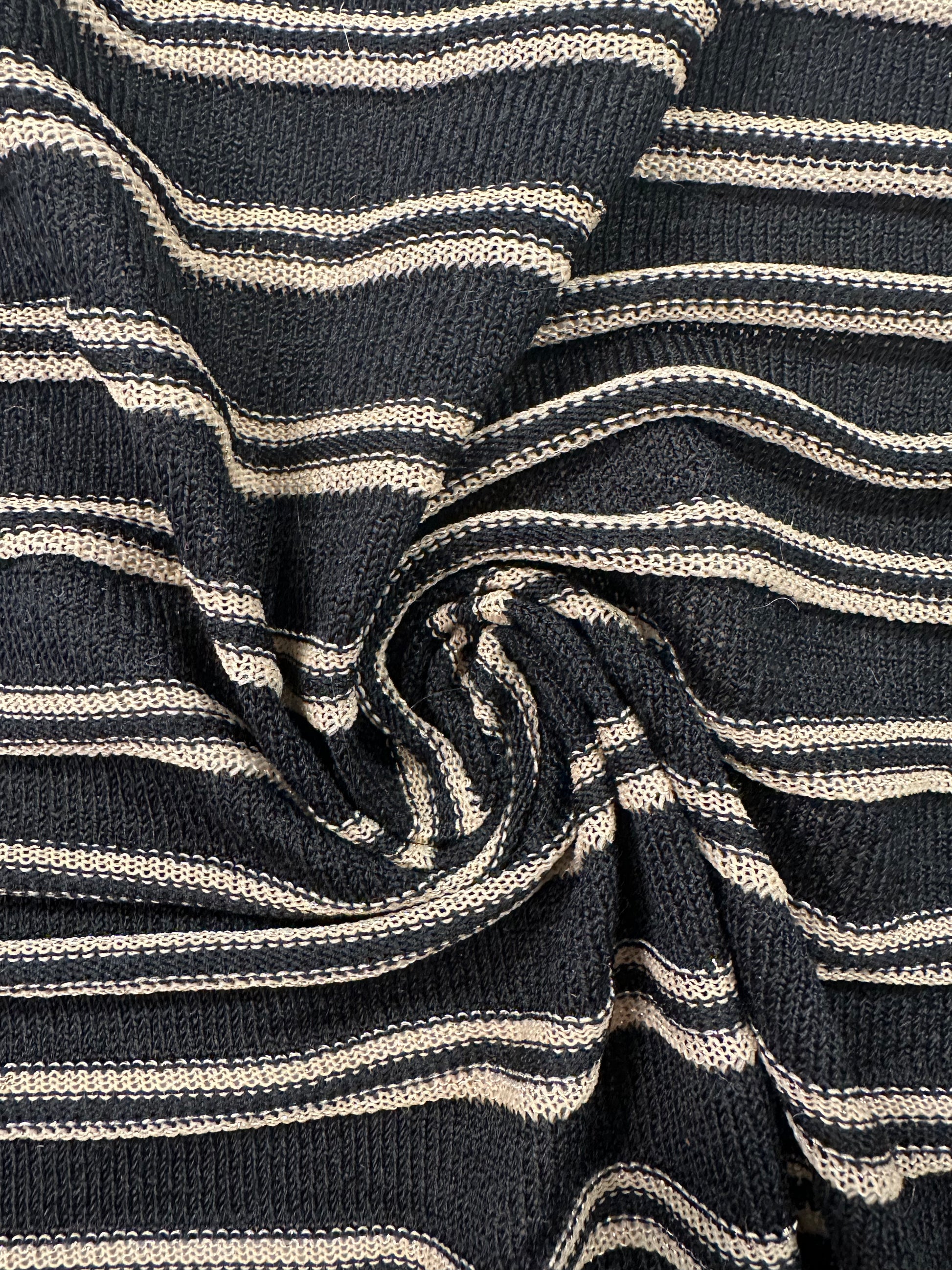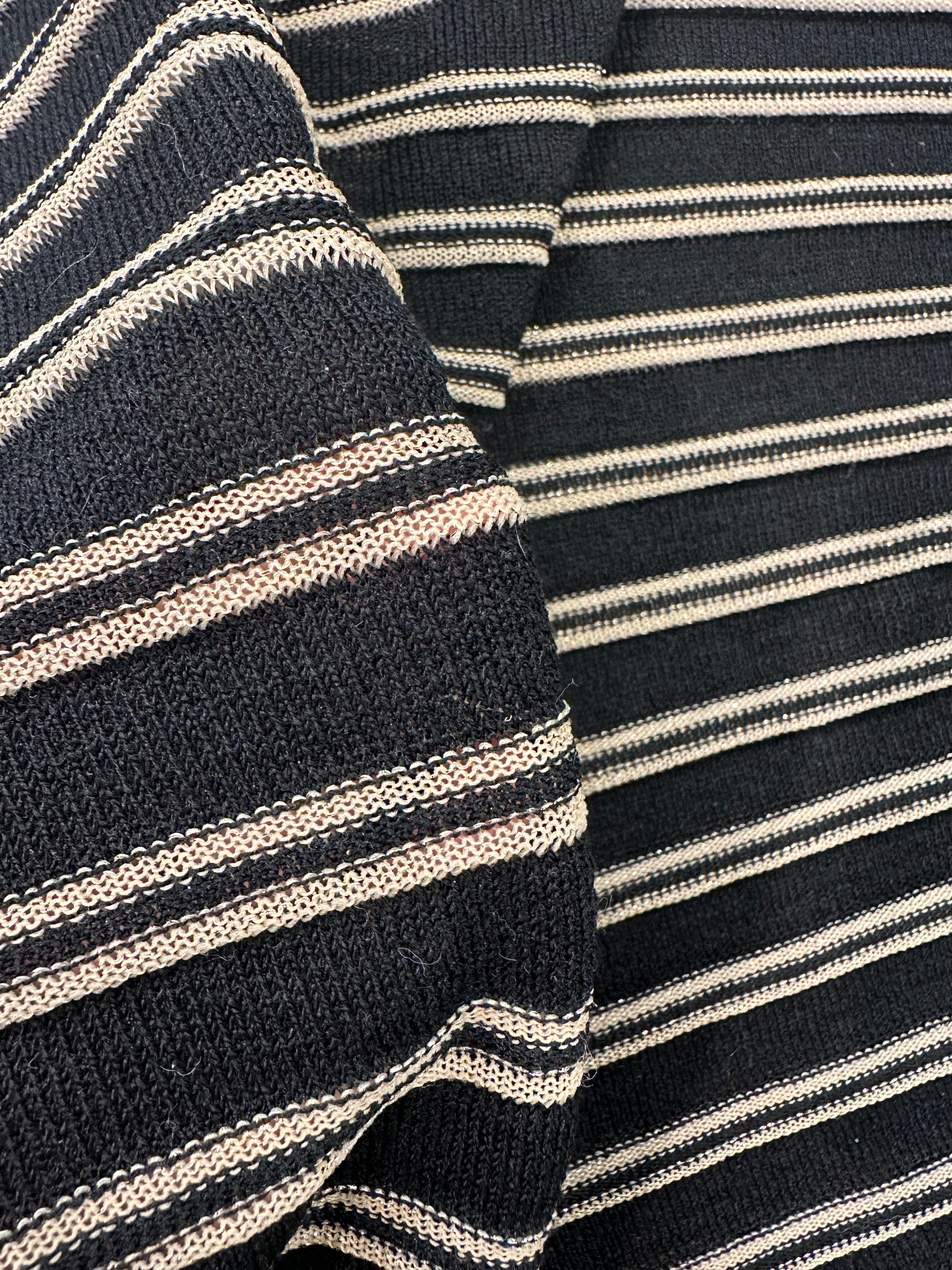 Villasekoiteneulos, joka soveltuu erityisesti paitoihin, tunikoihin ja neuletakkeihin. Mustaan sileään pintaan vaihtelua tuovat kullanväriset, nurjilla silmukoilla neulotut raidat.