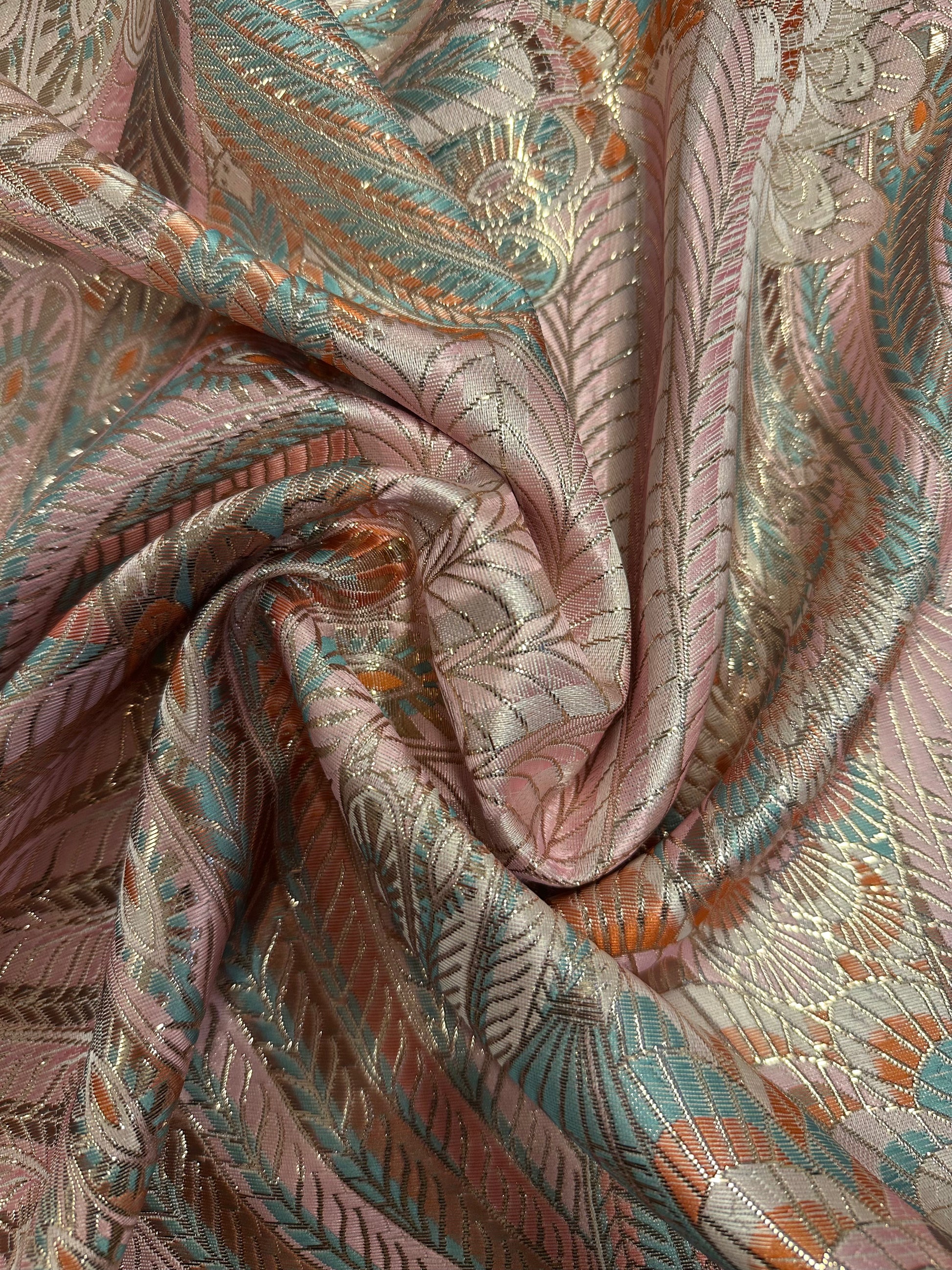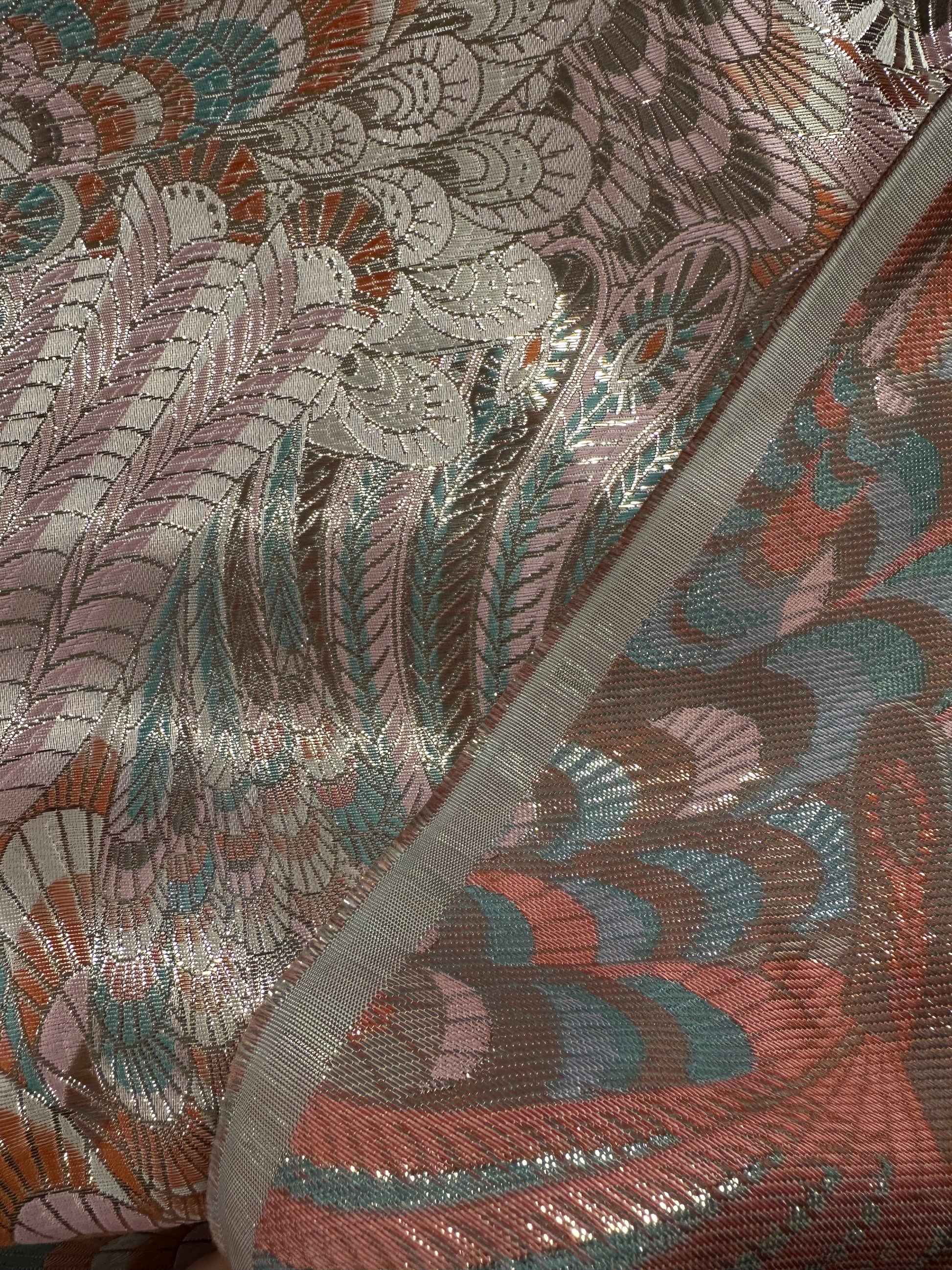 Kangas on läpikudottu jakardi, jossa on suuret kuviot ja upeasti kimmeltäviä ruusukullan värisiä lankoja kauttaaltaan.