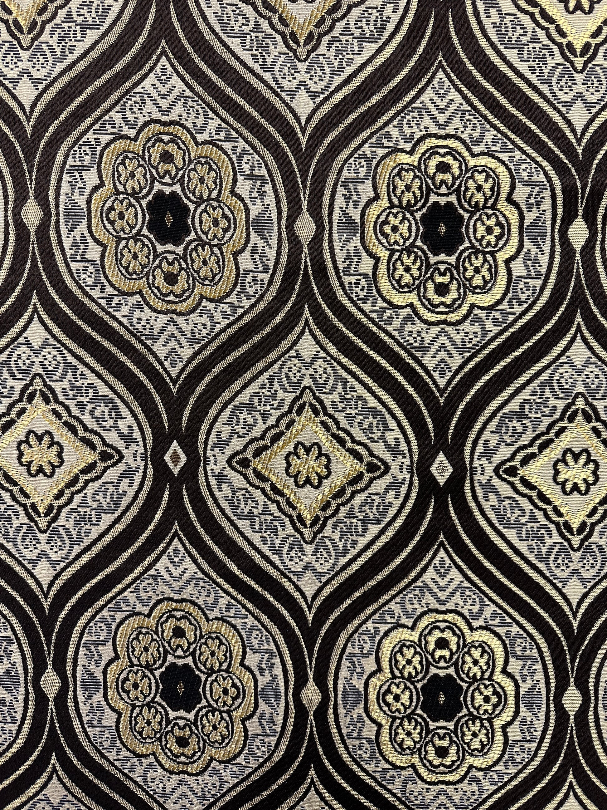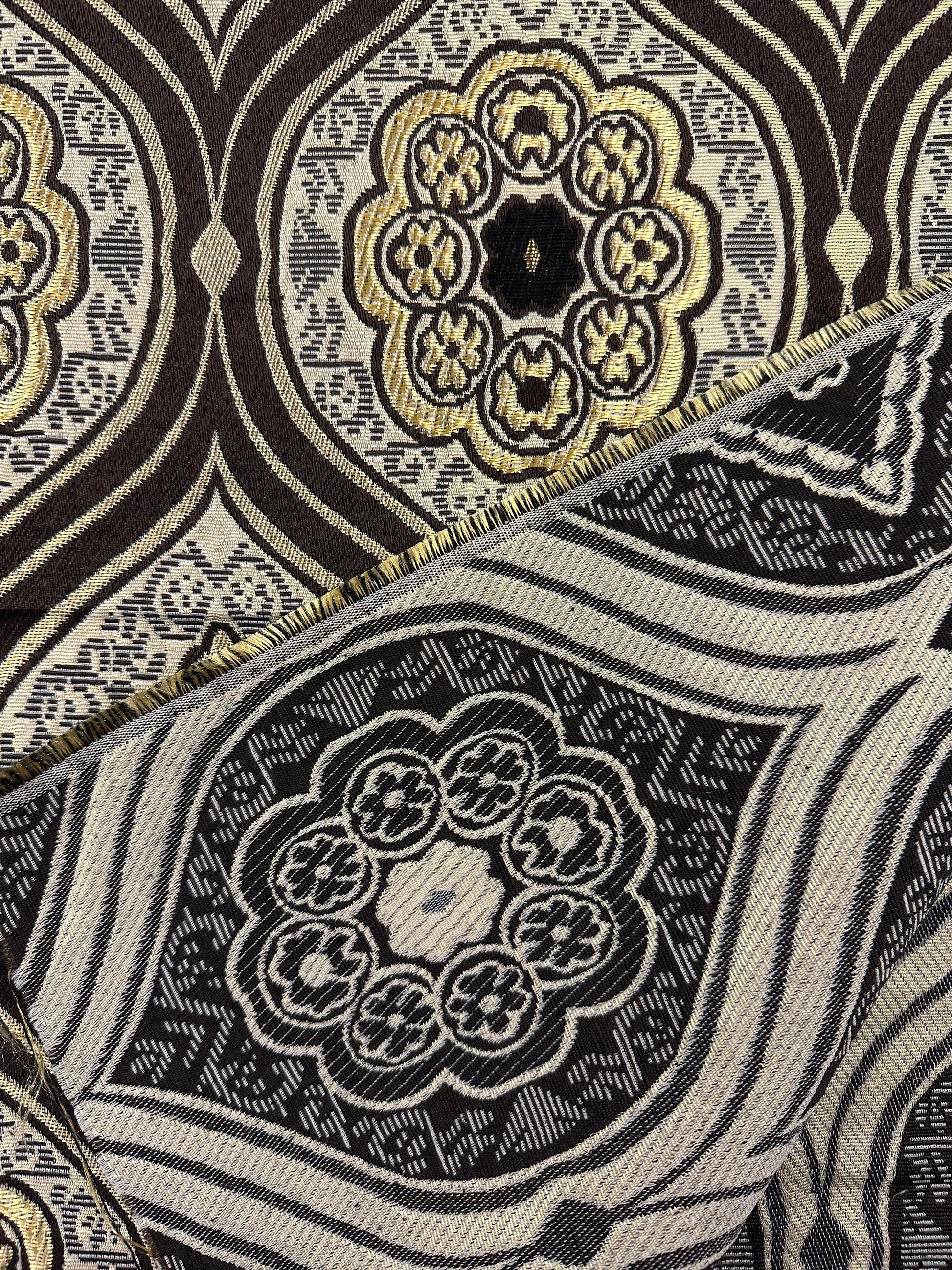 Gobeliinit ovat läpikudottuja kankaita, joista voi myös halutessaan käyttää nurjaa puolta. Tämä gobeliini on normaalia ohuempaa, joten sopii parhaiten vaateompeluun. Etenkin kääntötakki on kankaan kaksipuolisuuden vuoksi nerokas.