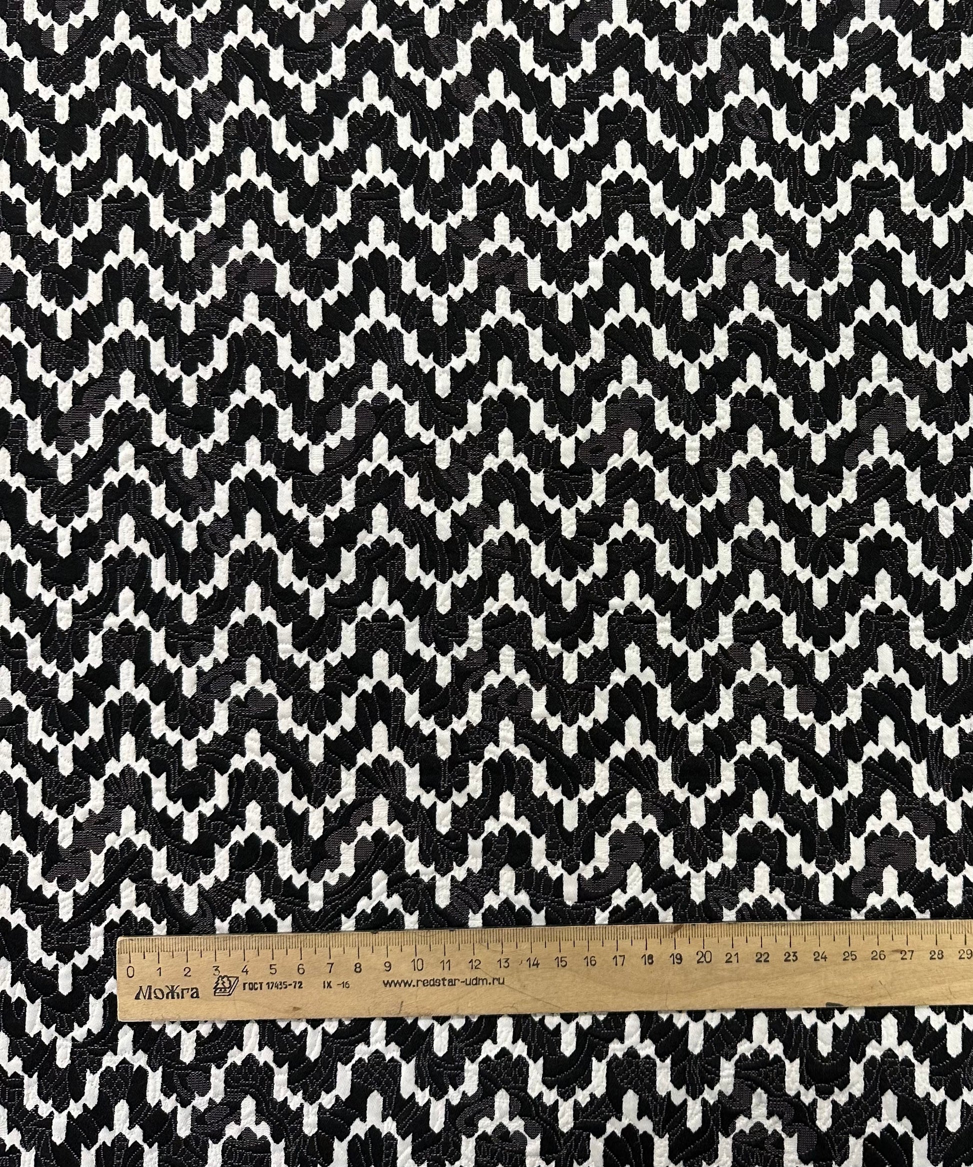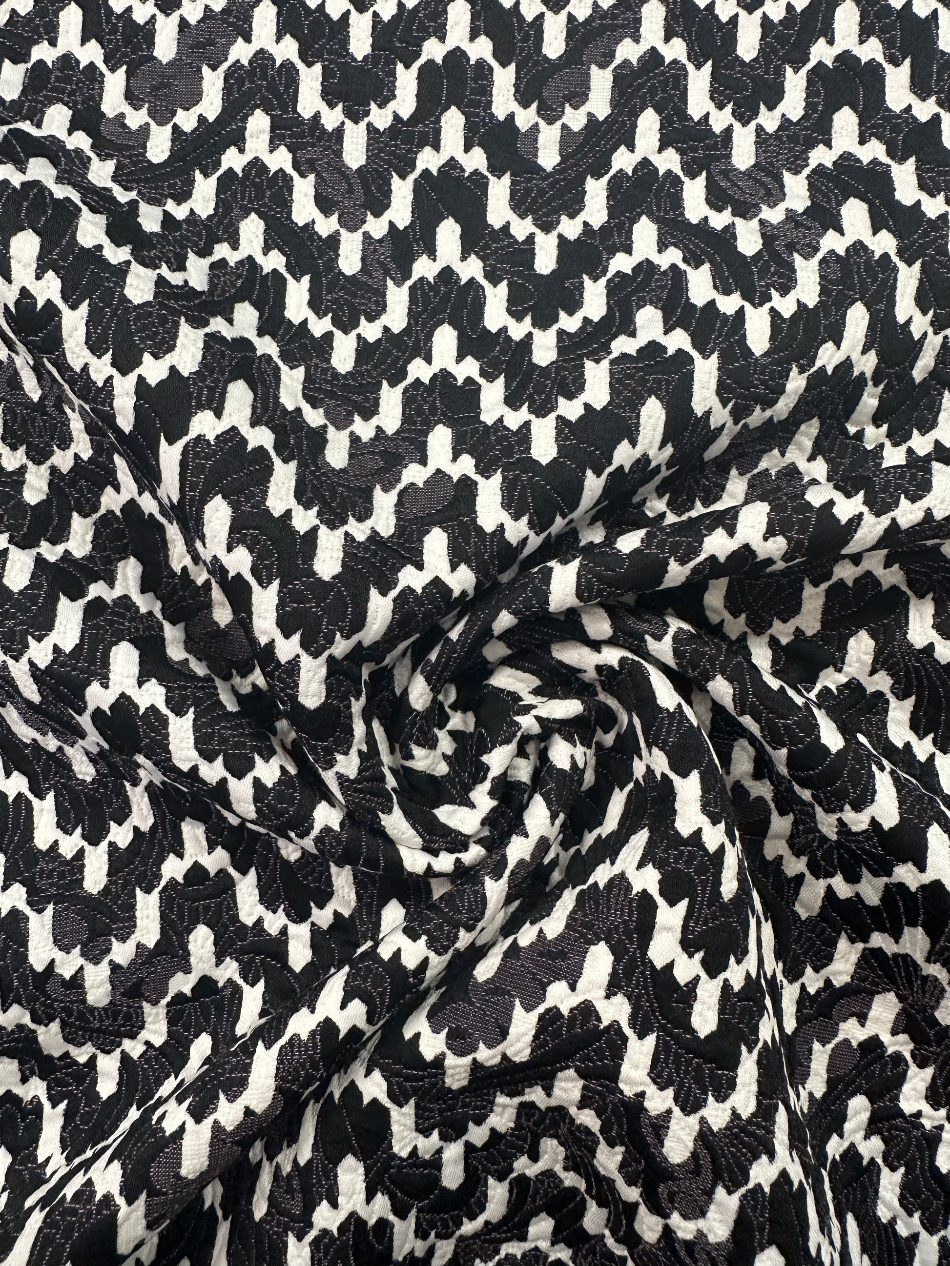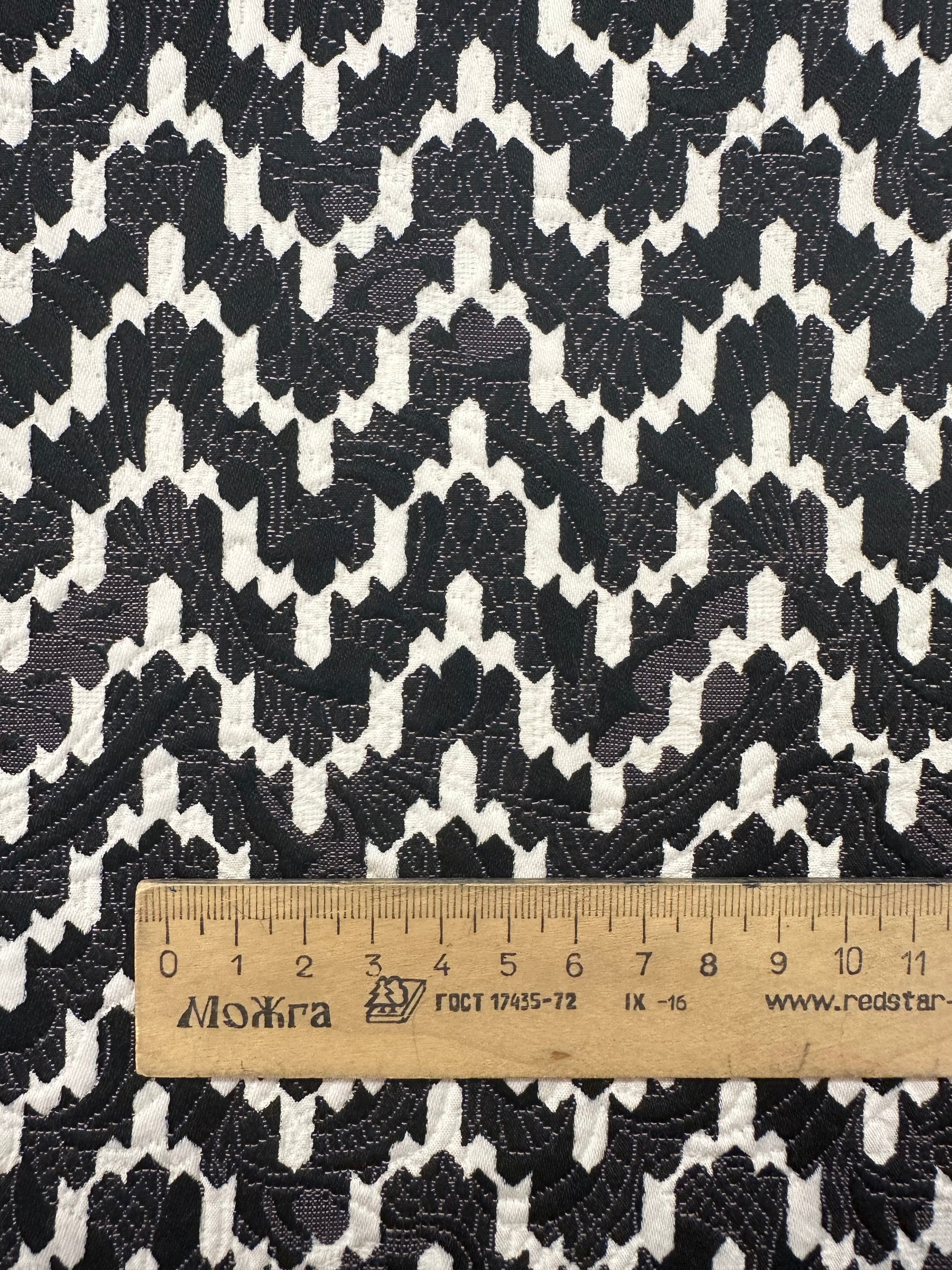 Puuvillasekoite jakardi, jossa musta painokuvio. Voi käyttää esim juhlavaatteisiin, jakkuihin tai pukuihin.