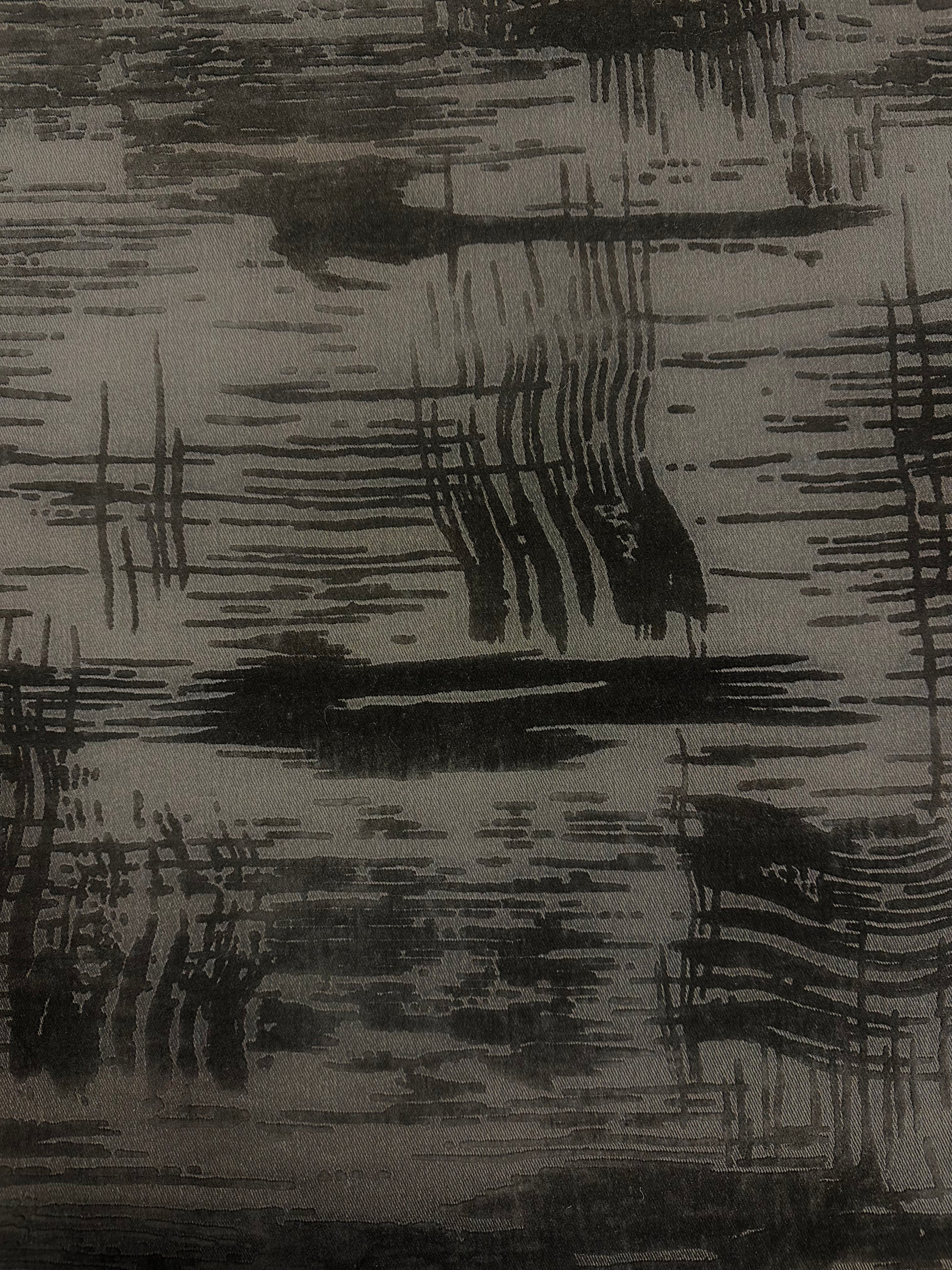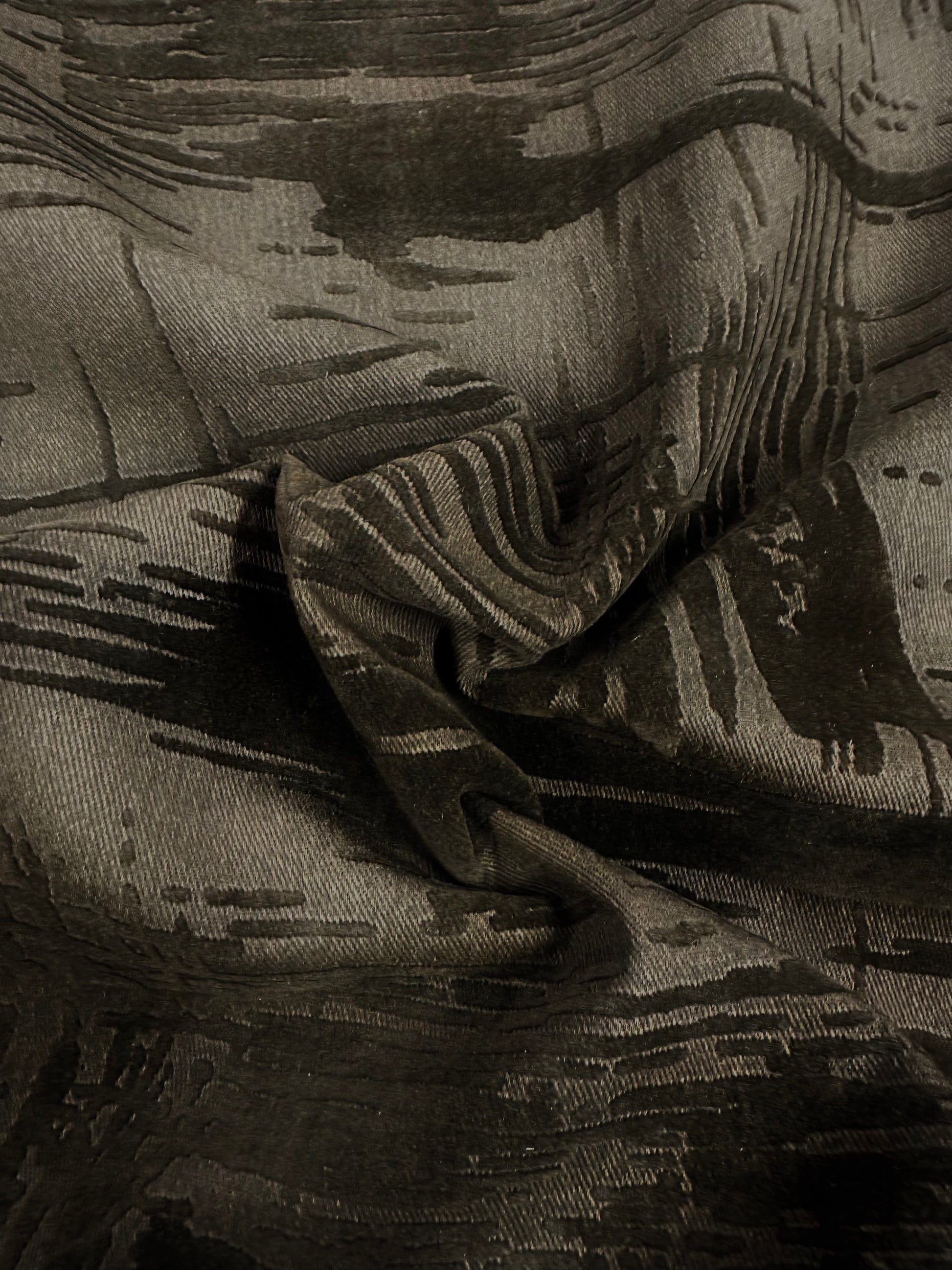 Joustava farkkukangas samettipainatuksella. Farkun pohjaväri on tumma suklaanruskea ja samettipainatukset ovat samaa sävyä. Väri on luonnossa lämpimämpi kuin kuvassa.