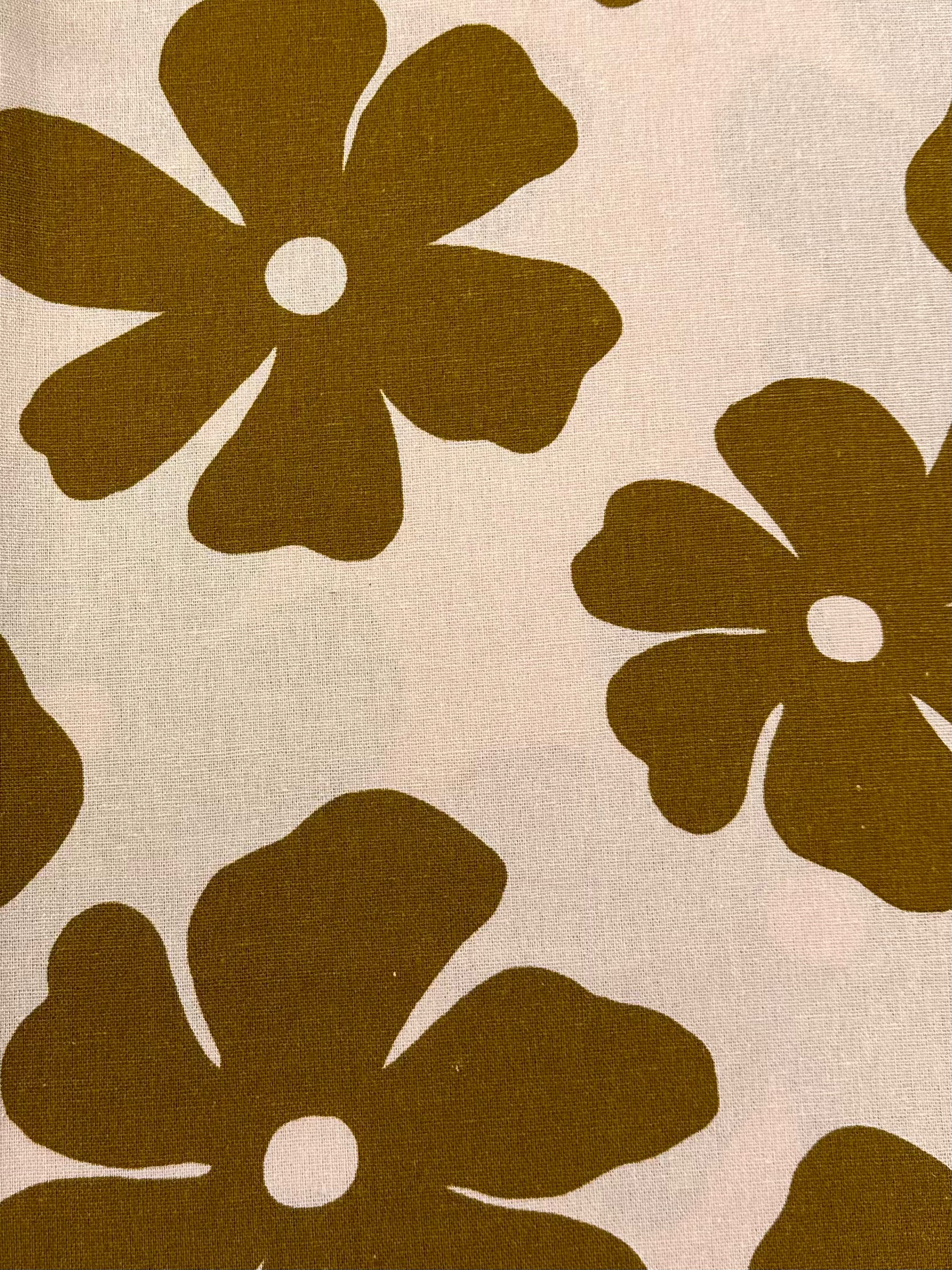 Tämä pellavasekoite sopii hyvin esim. tunikoihin, paitoihin ja mekkoihin. Kangas laskeutuu kauniisti ja sen tuntu on pehmeä. Kukkien sävy vaalean ruskea ja taustakankaan sävy on vaaleanpunainen.