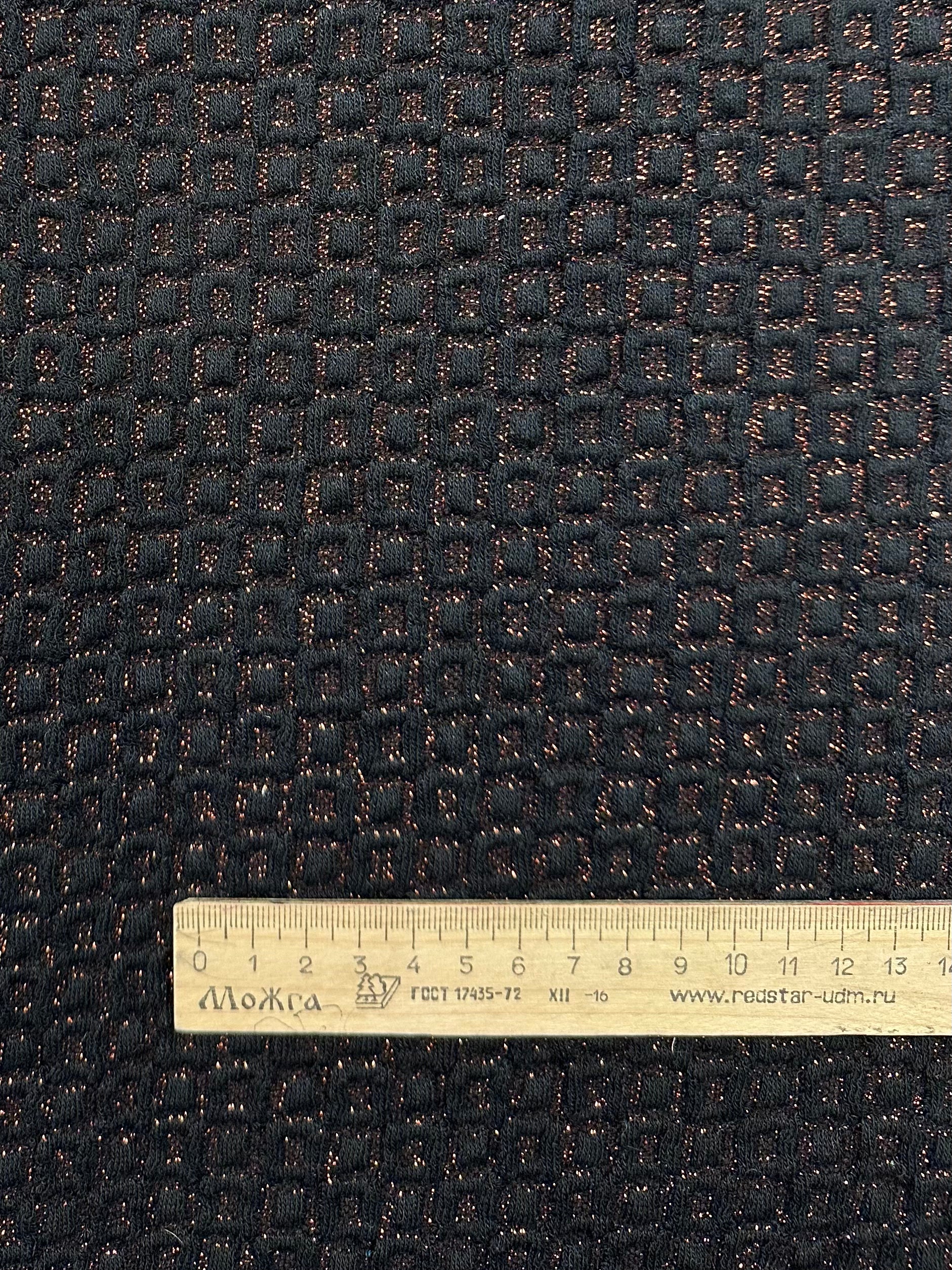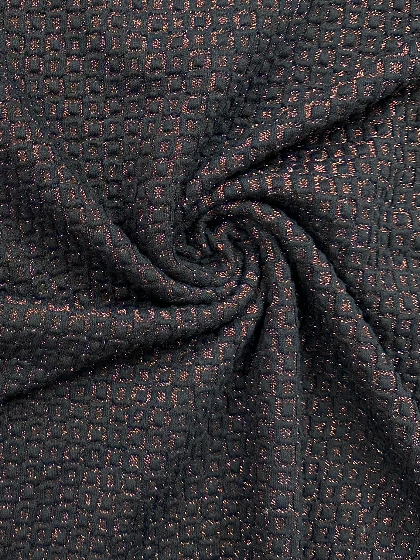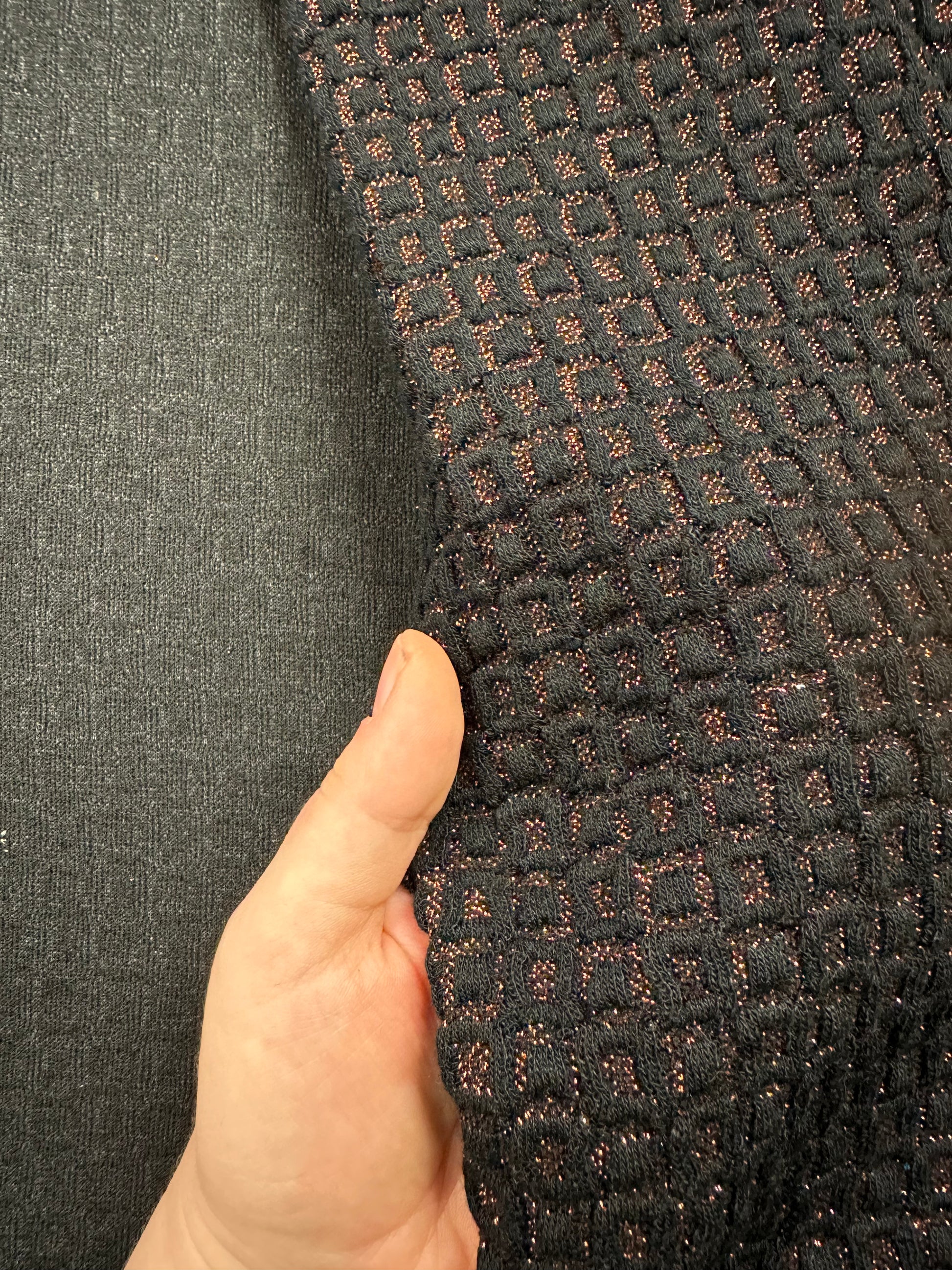 Tämä upea musta-kuparikiiltoinen neulos laskeutuu pehmeästi ja miellyttävästi. Tästä saat esim. hyvät paidat, tunikat, mekot ja vaikkapa neuloshousut, kevyet pusakat jne. Voit käyttää trikoille tehtyä kaavaa. Kankaasta ei näy läpi. Kangas on kaksinkertaisesti kudottu.