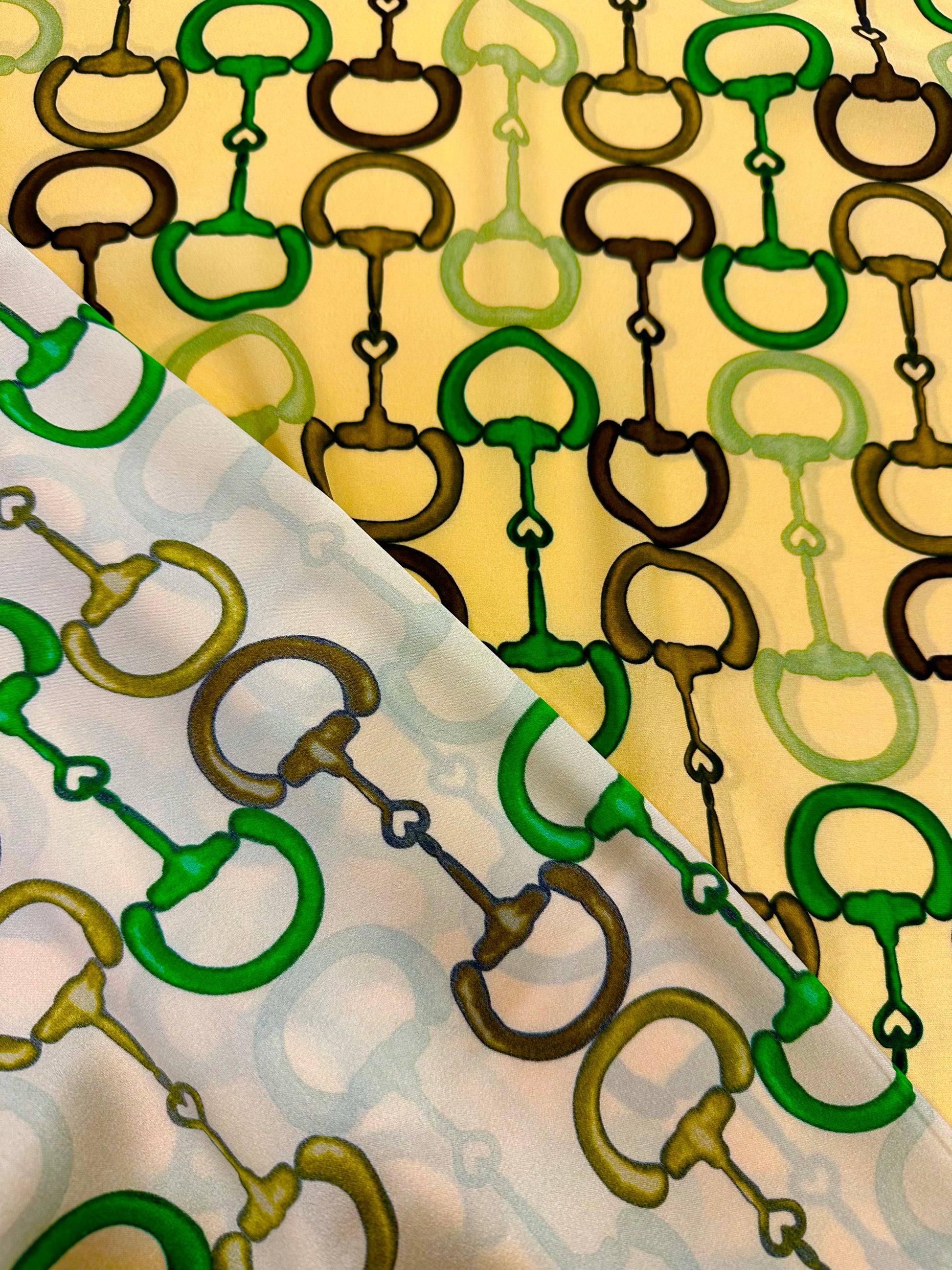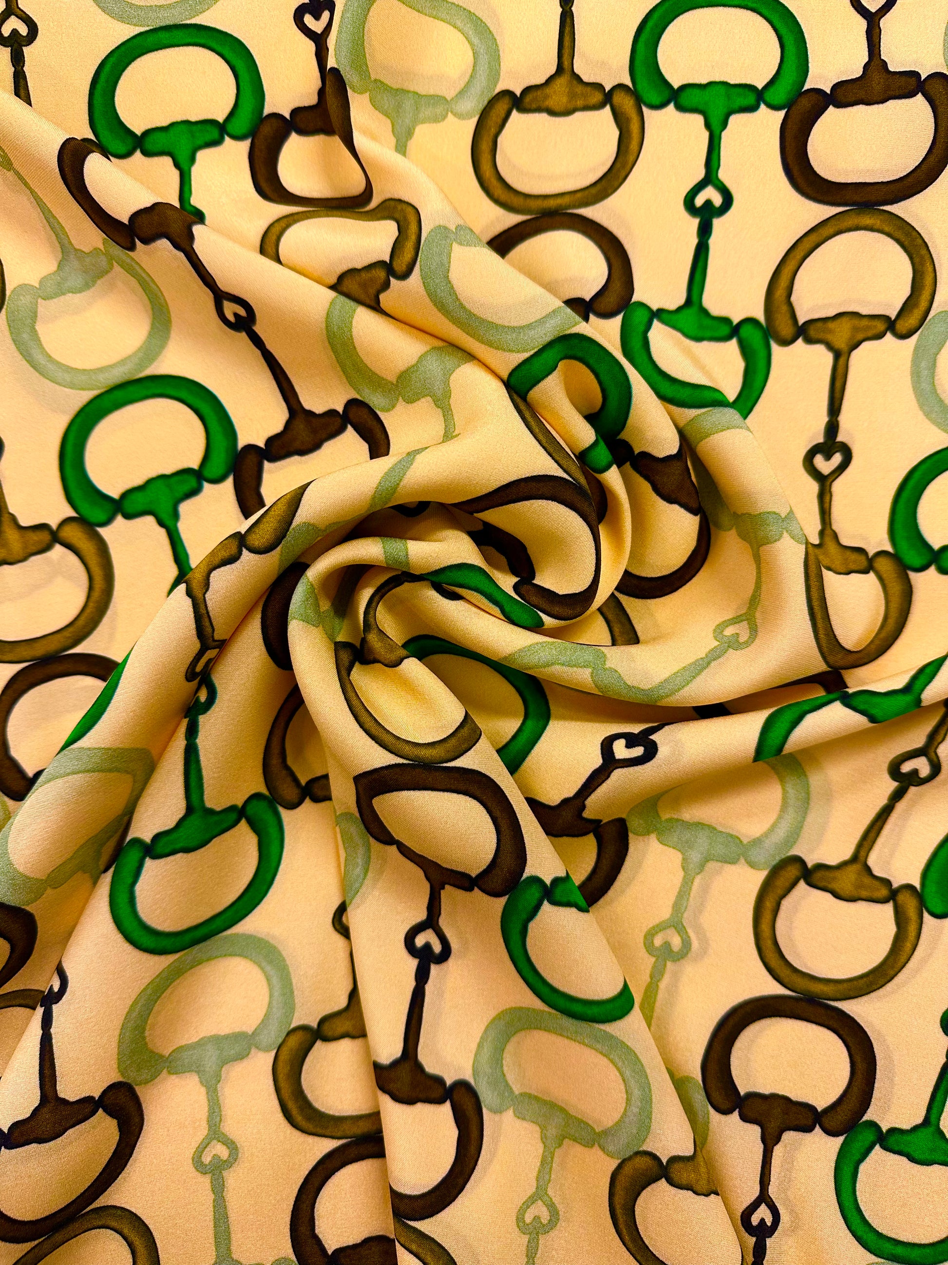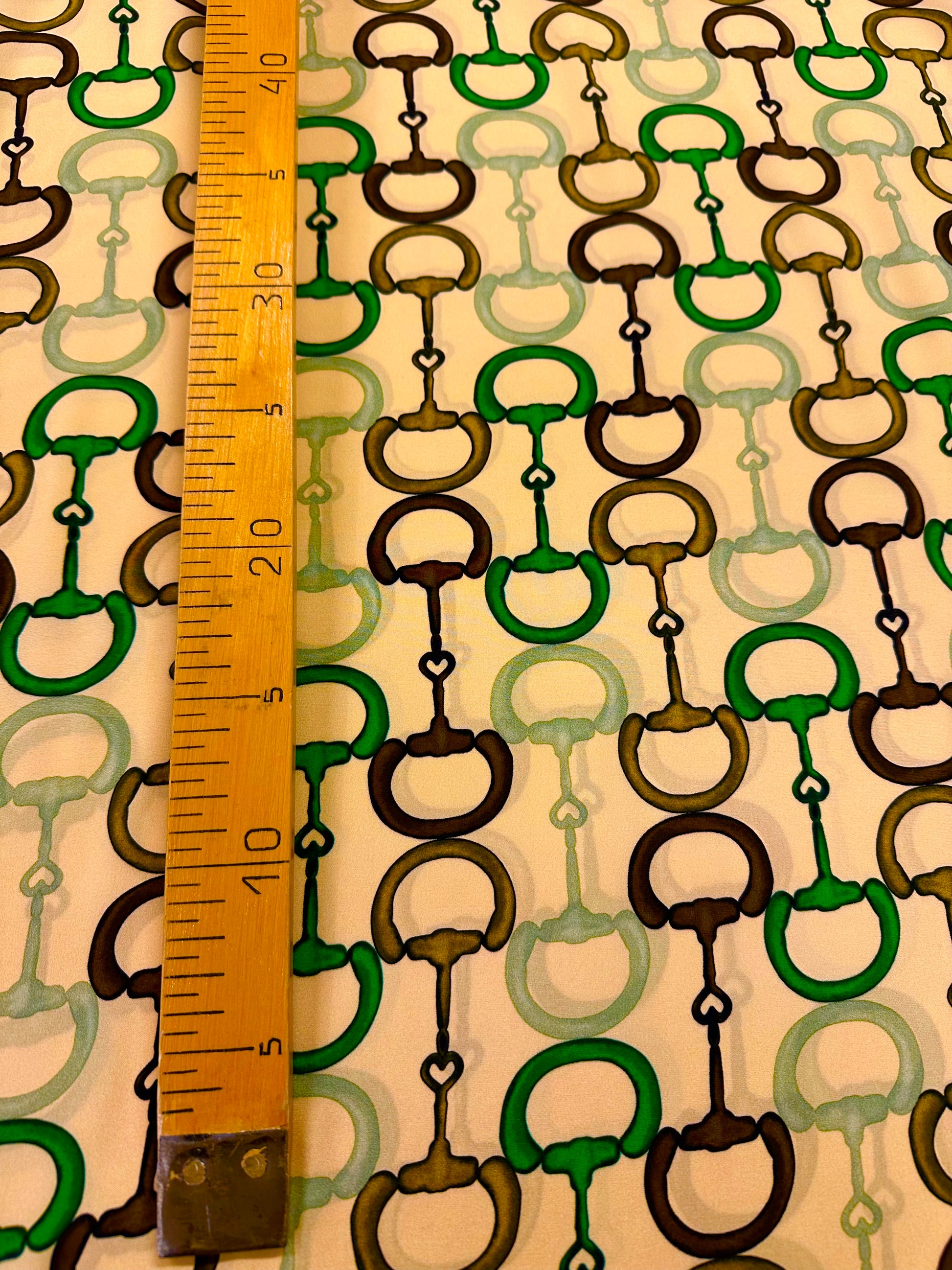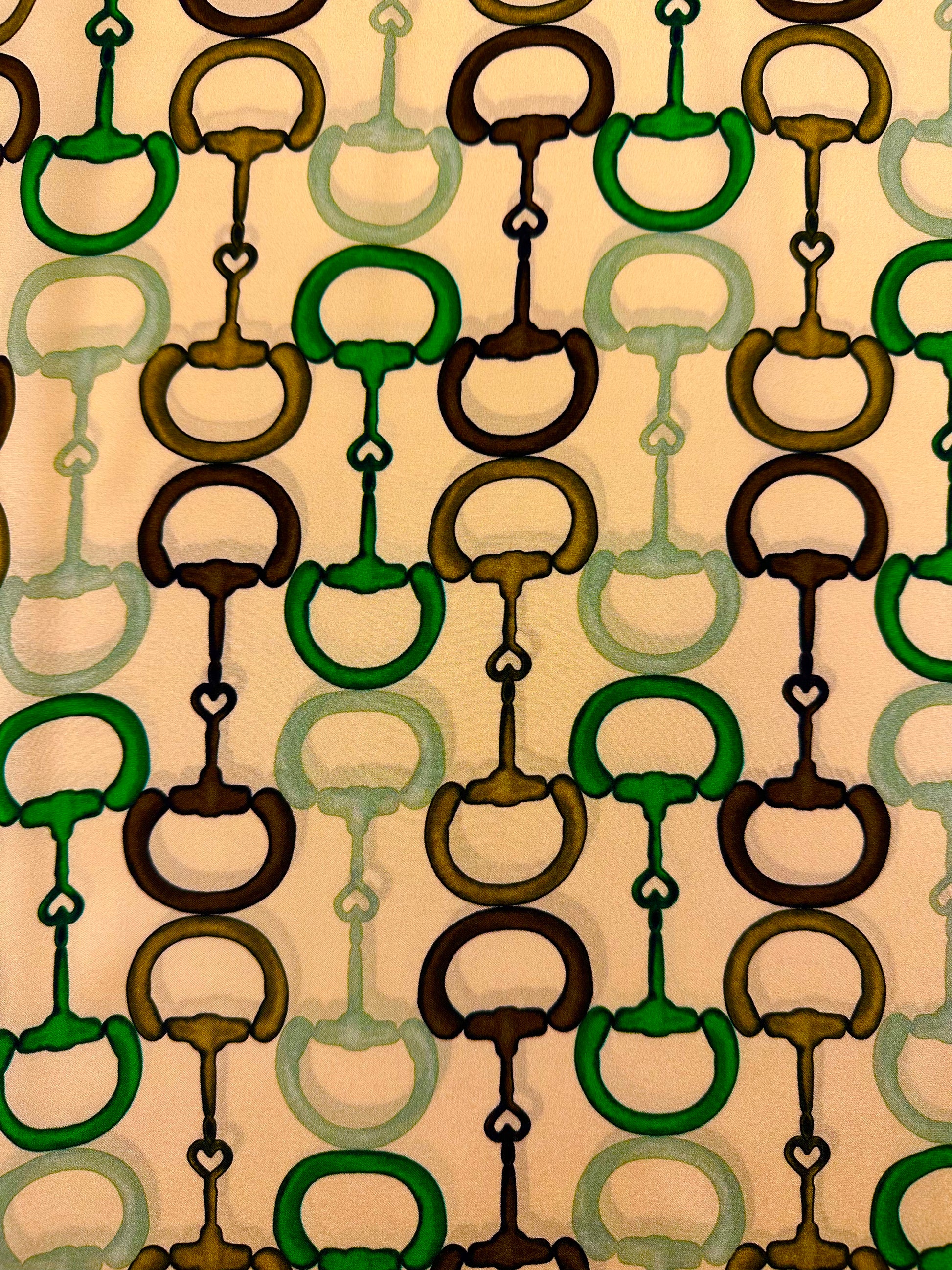 Tämä upea Gucci silkki laskeutuu kauniisti ja siinä on pehmeä kiilto nurjalla puolella. Sopii erinomaisesti paitoihin, huiveihin, mekkoihin ja hameisiin. Kuvio painettu kankaaseen.