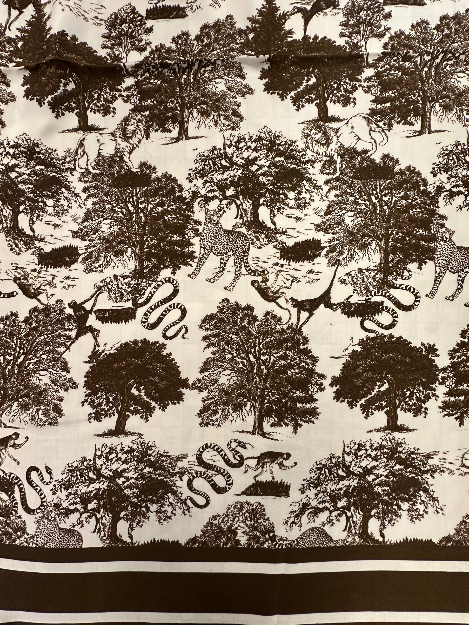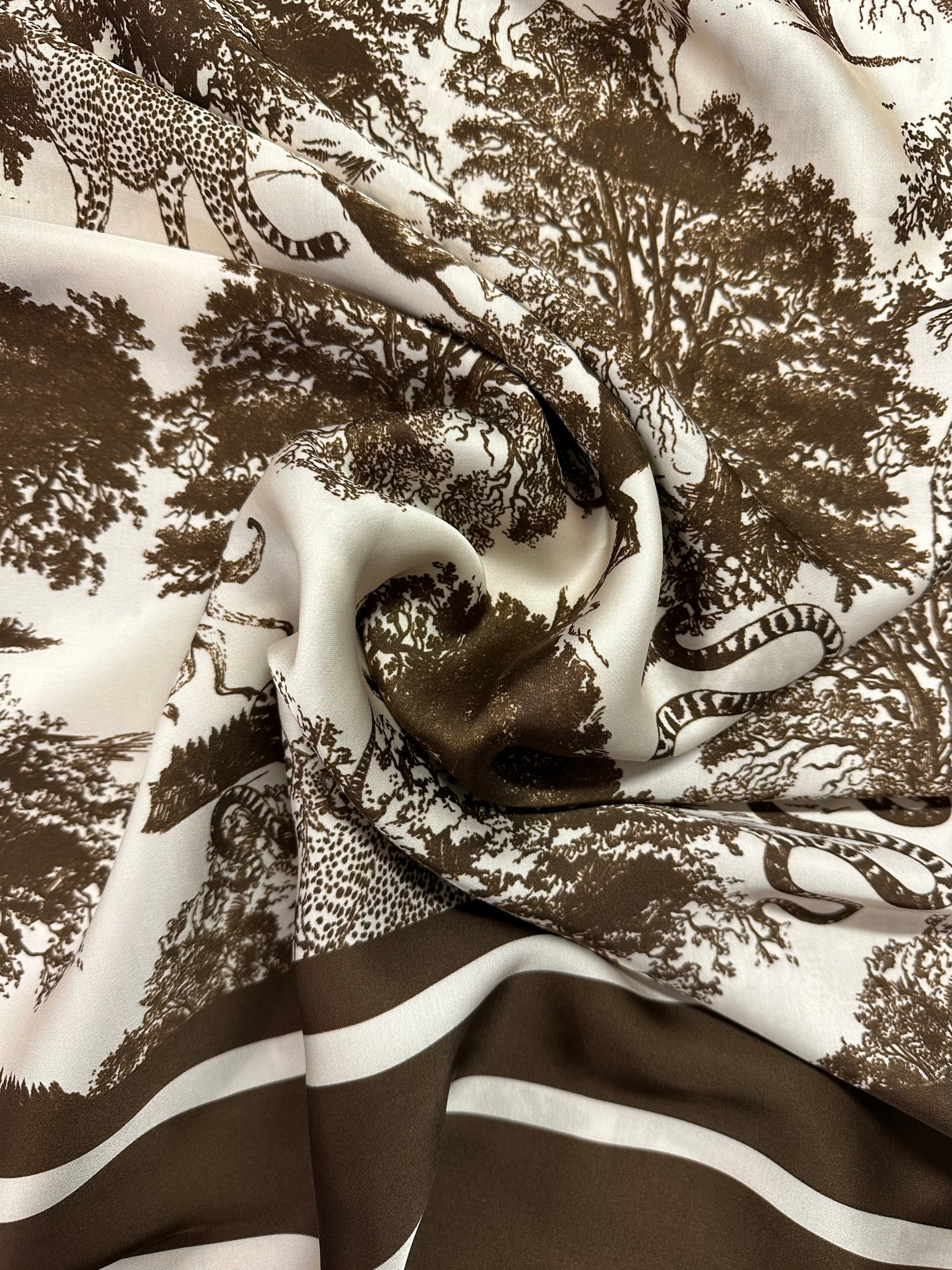 Tämä suklaanruskea satiiniviskoosi on ohut ja sileäpintainen. Kangas laskeutuu kauniisti ja kevyesti. Kangas ei ole läpinäkyvä mikä antaa lisää käyttömukavuutta. Kuvio on painettu poikittain, sivussa on 16 cm korkea bordi.