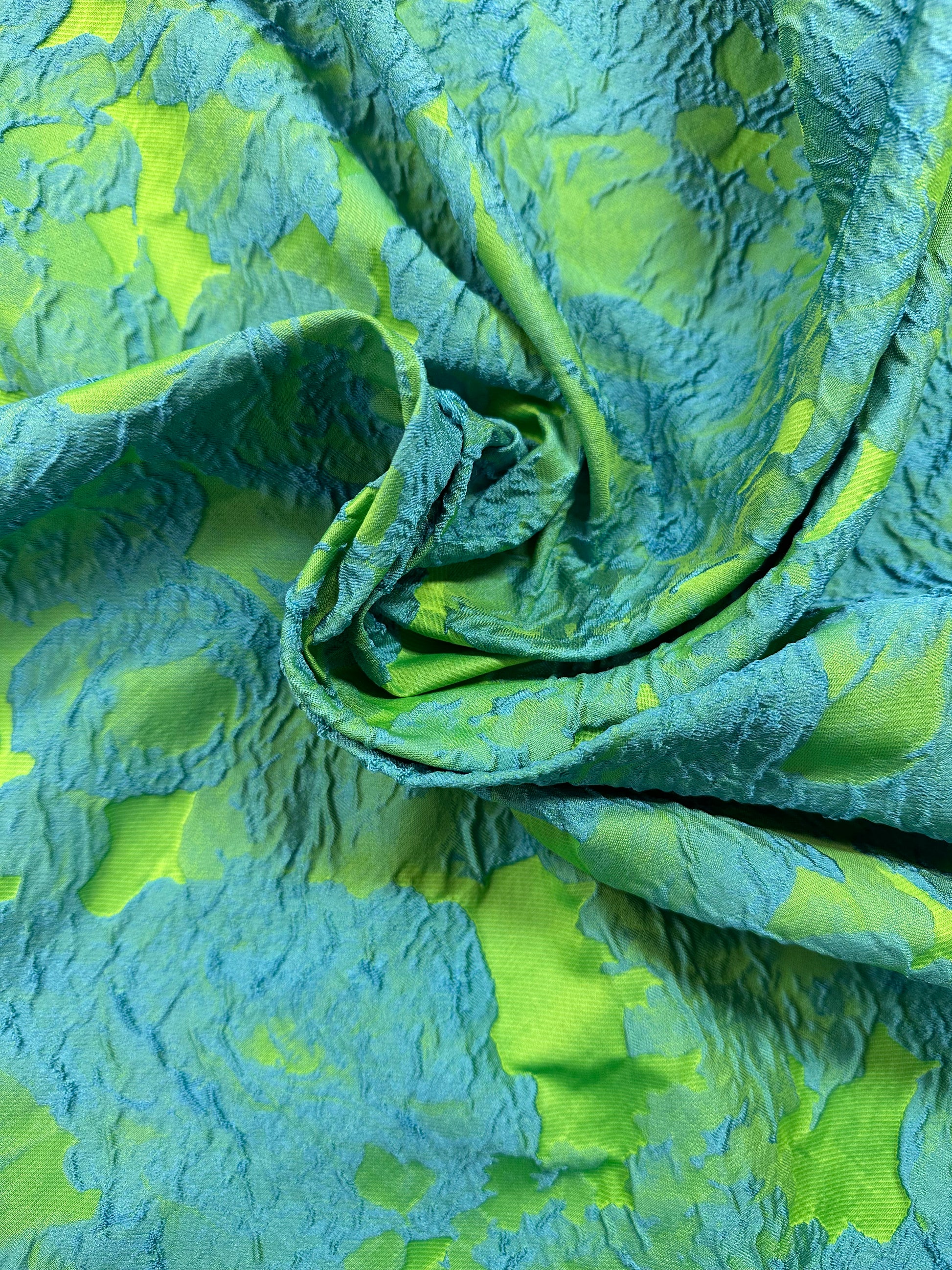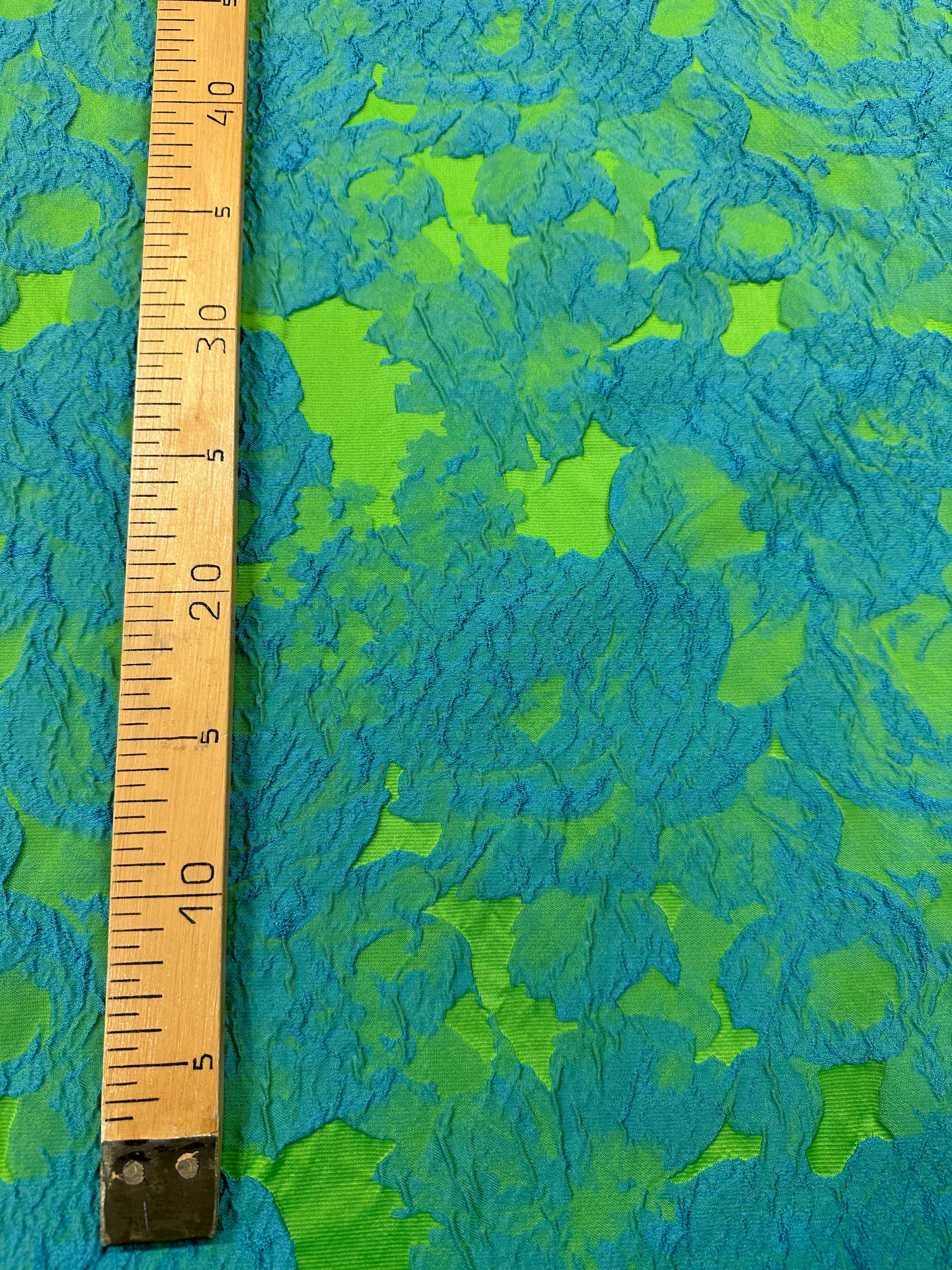 KENZON huikean värinen juhlakangas, josta saa myös persoonallisia ja näyttäviä arkivaatteita. Pohja on limetinvihreä ja hillityn kiiltävä; jakardi-kohokuviointi on taivaansininen.