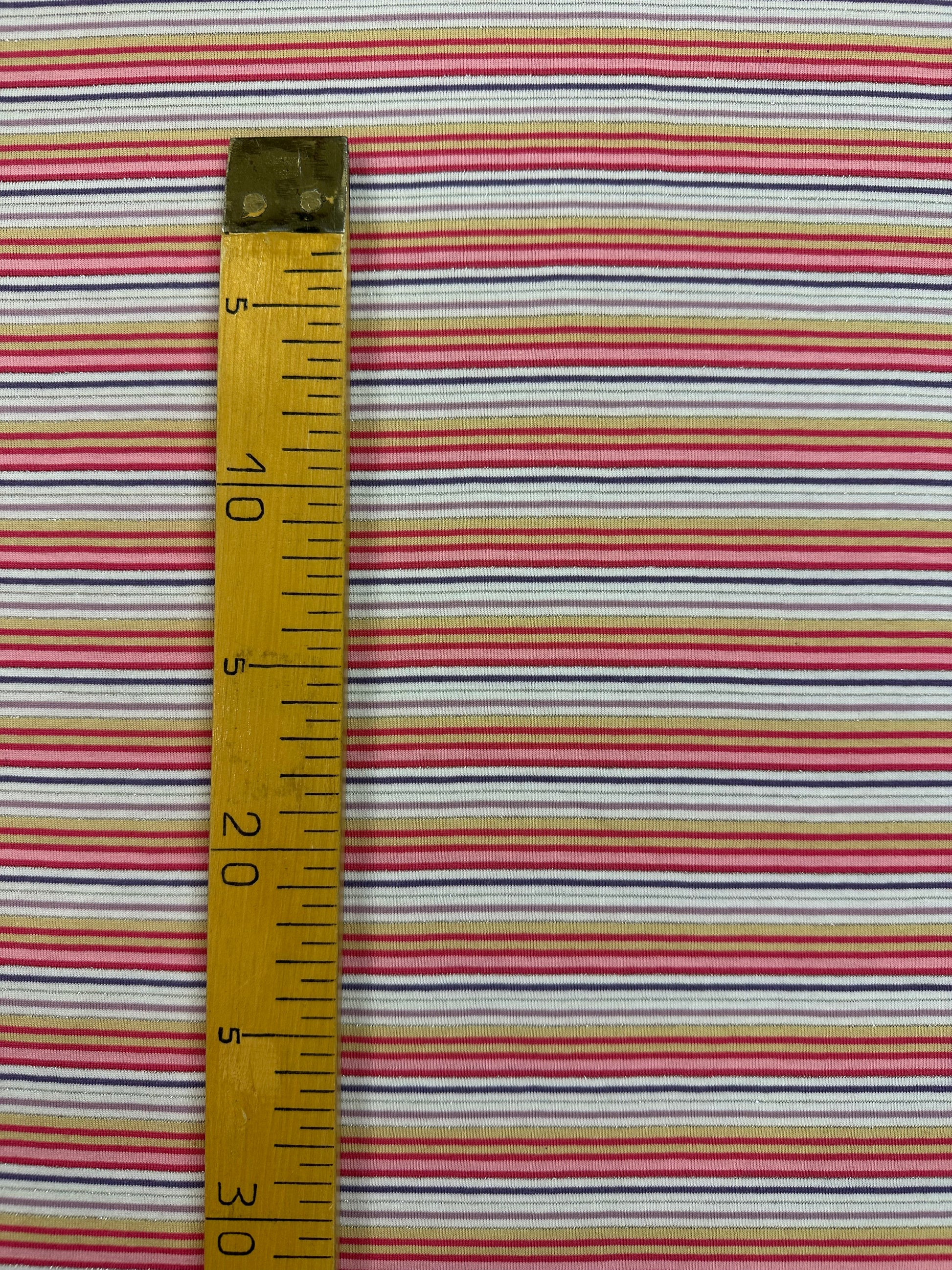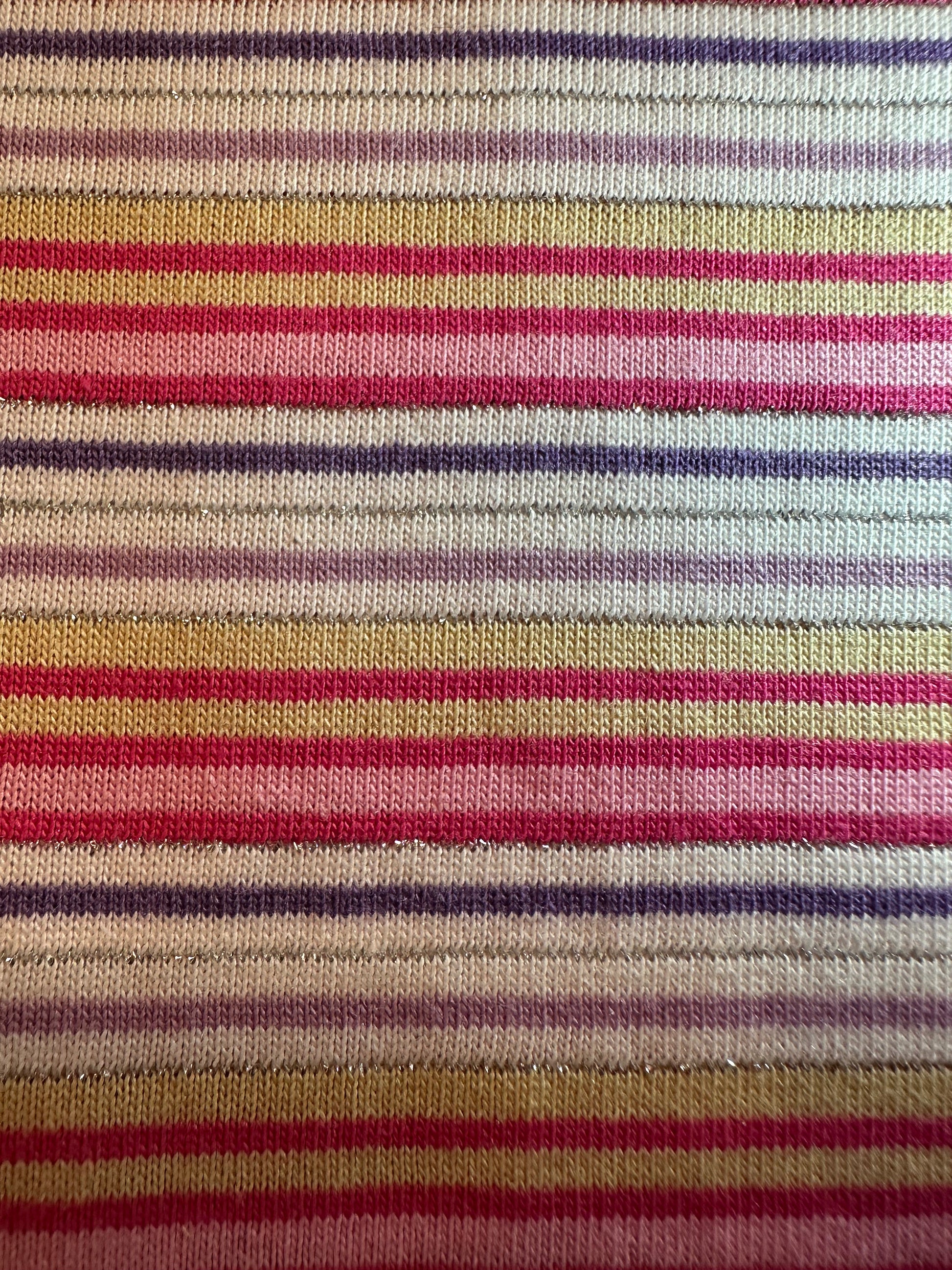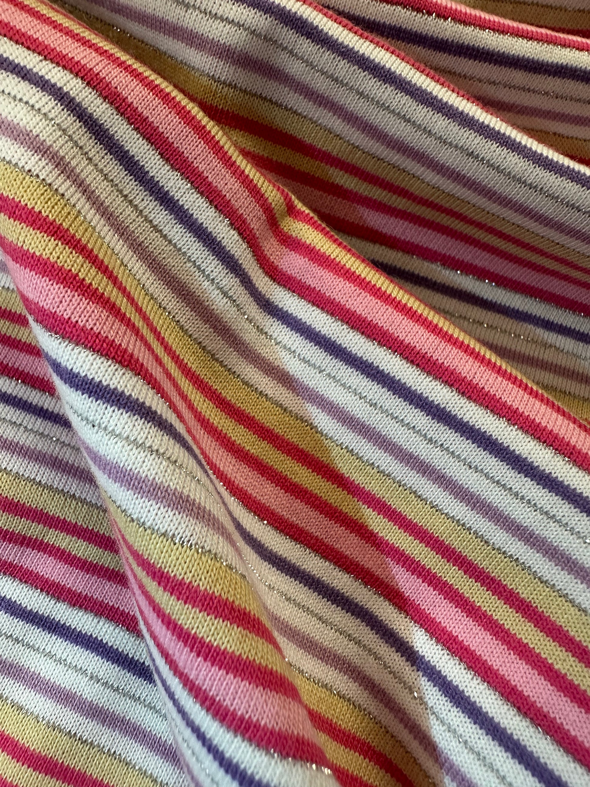 Kankaassa on ohuita, hopeisena kimaltavia lurex-raitoja väriraitojen joukossa. Kimallus on kuin helmikuisella pakkashangella, mutta sitä ei valitettavasti saa vangittua kuviin.