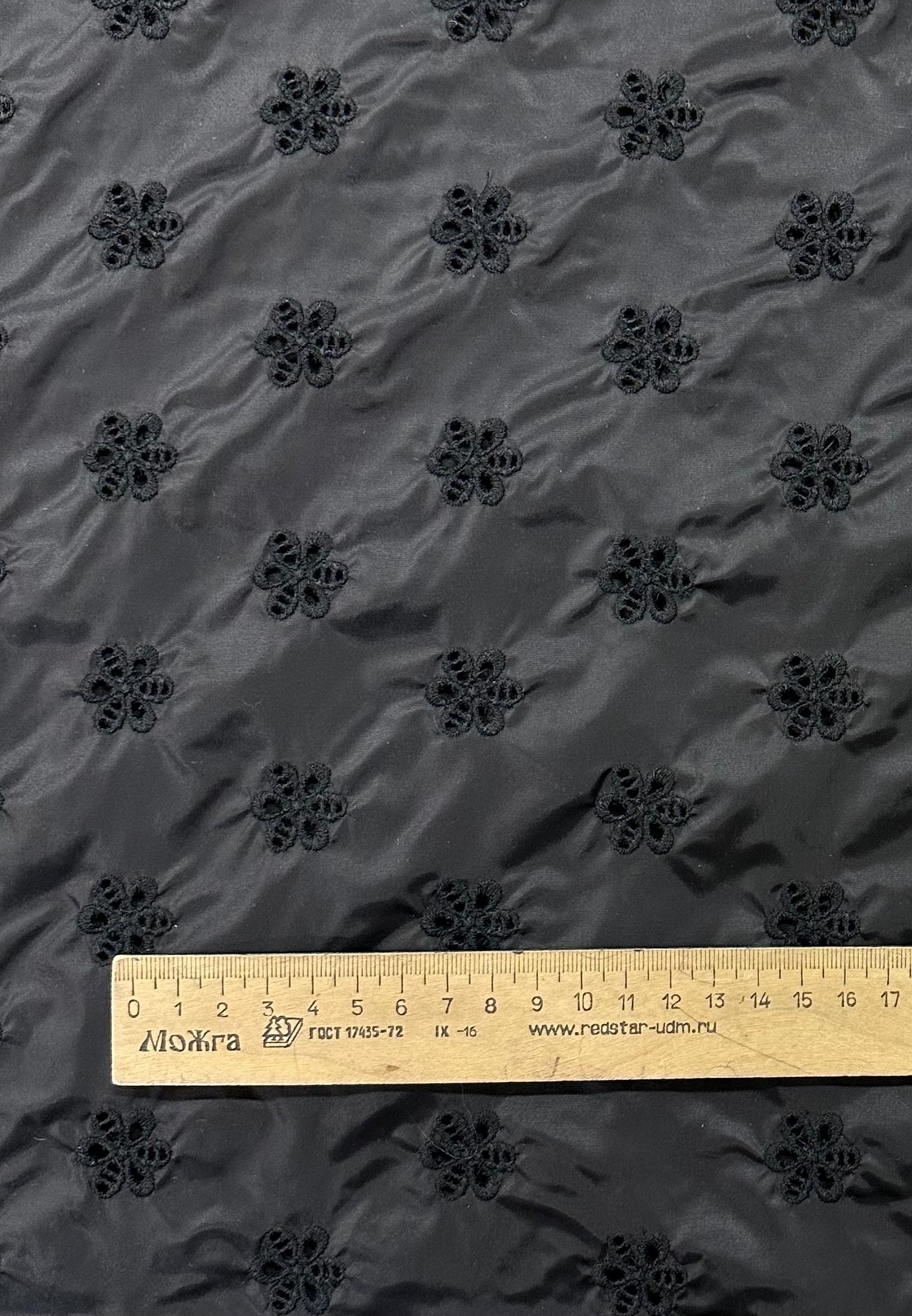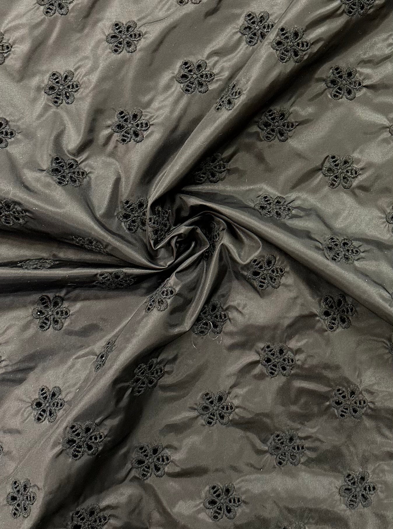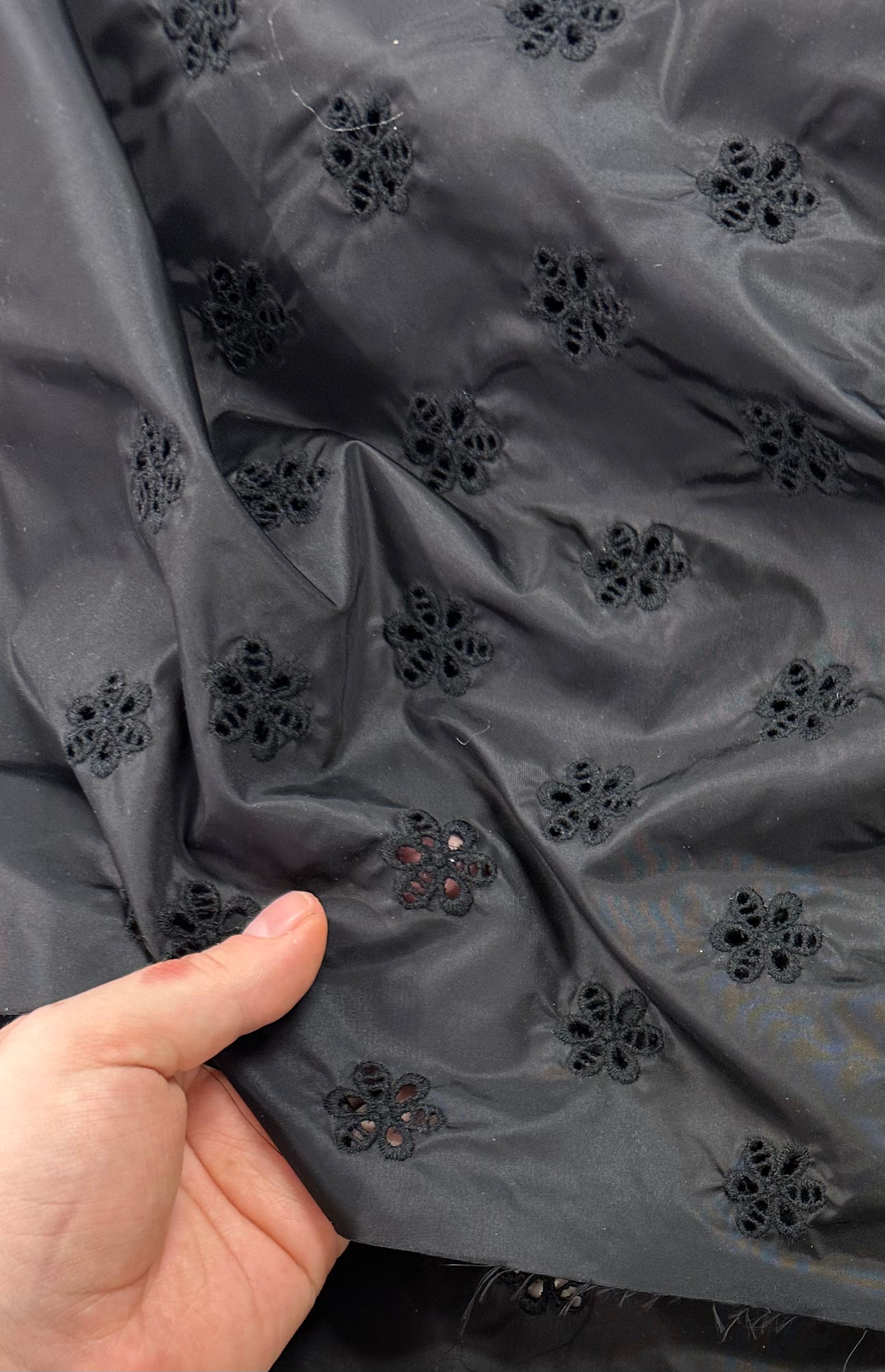 Upea Pradan musta reikäbrodeerattu, ihanasti kahiseva polyamidisekoitekangas, jossa hento kiilto. Huom! brodeerauskuvio loppuu toisesssa reunassa 6 cm ja toisessa 12 cm ennen hulpiota.