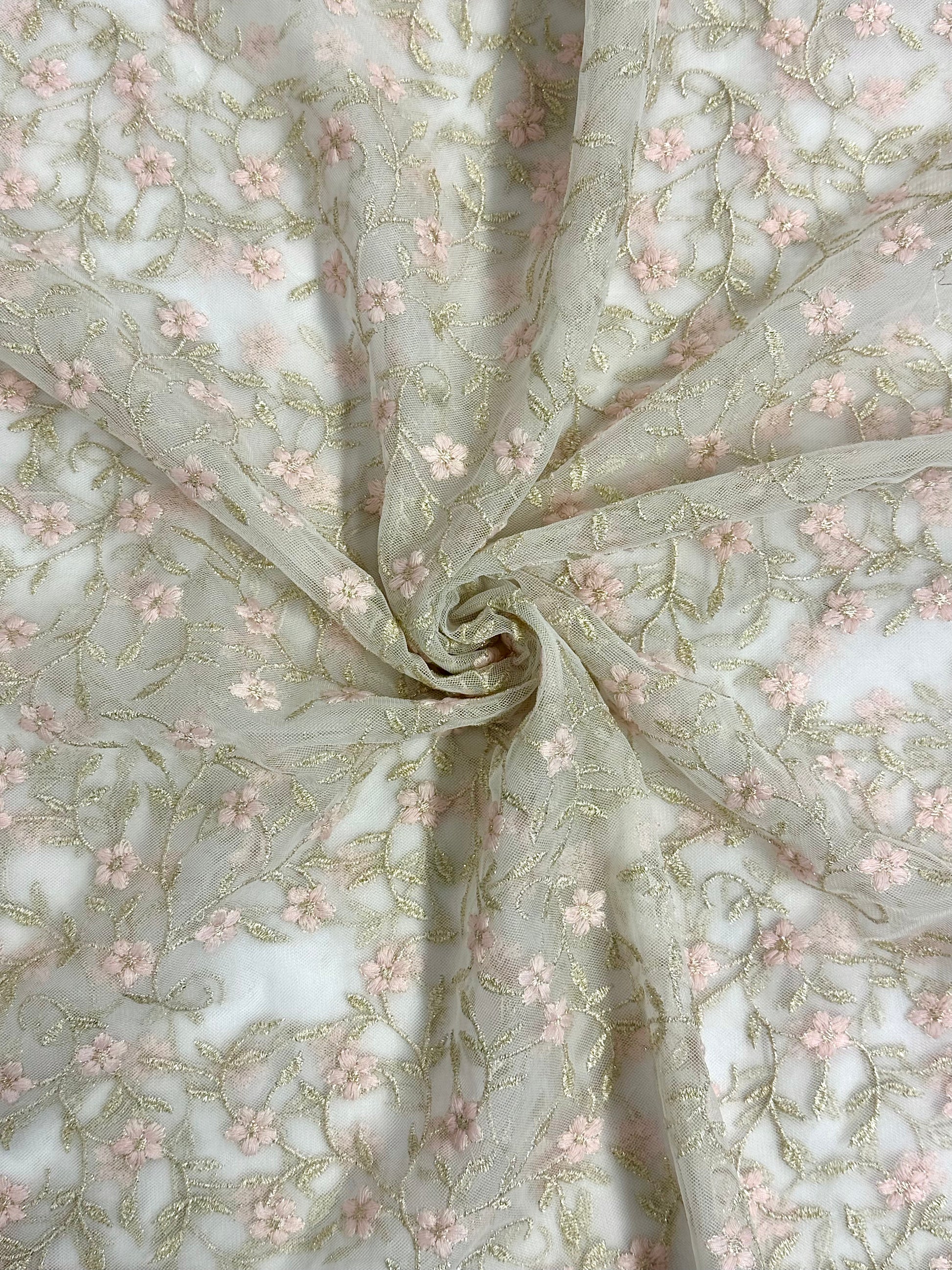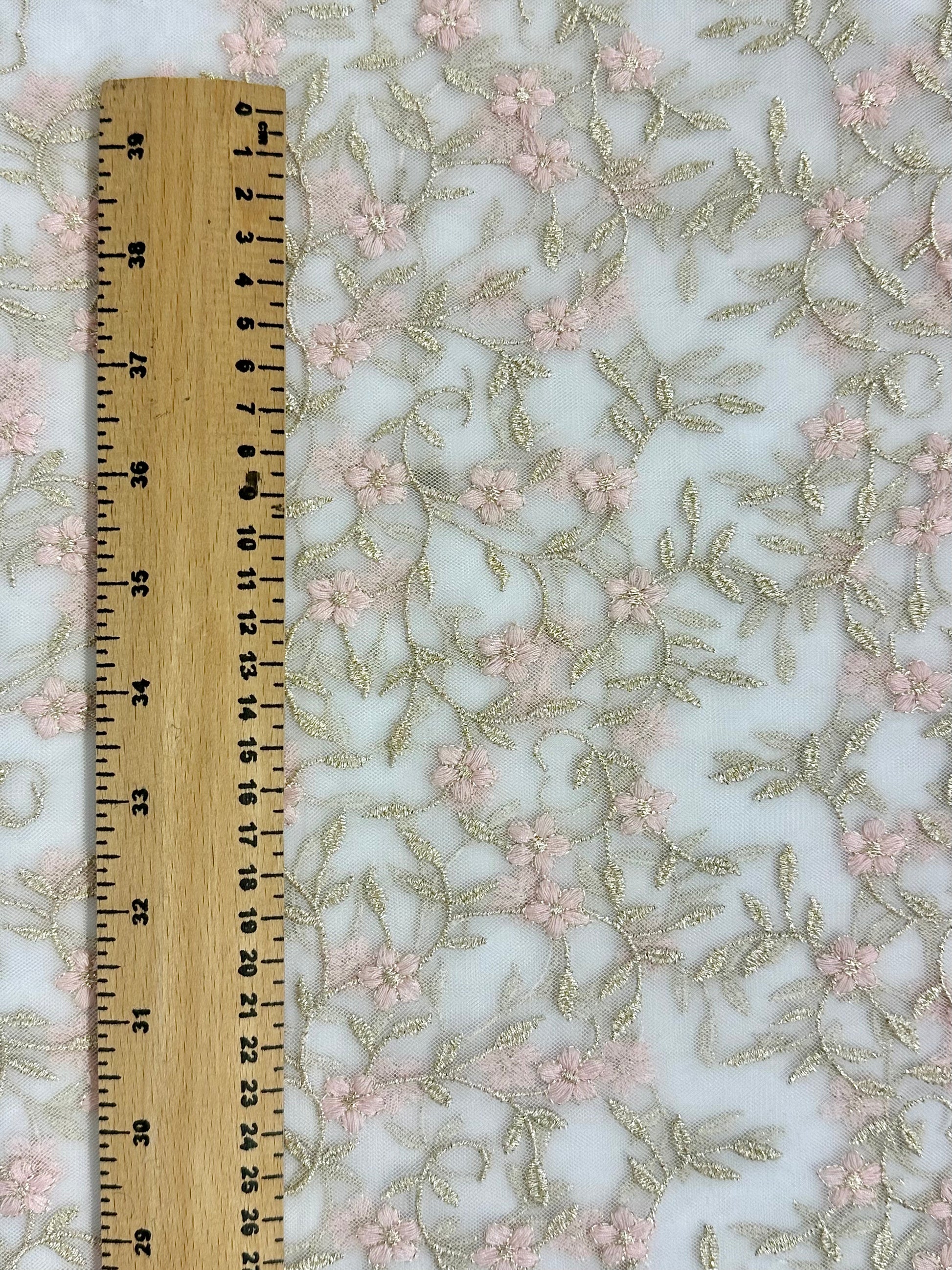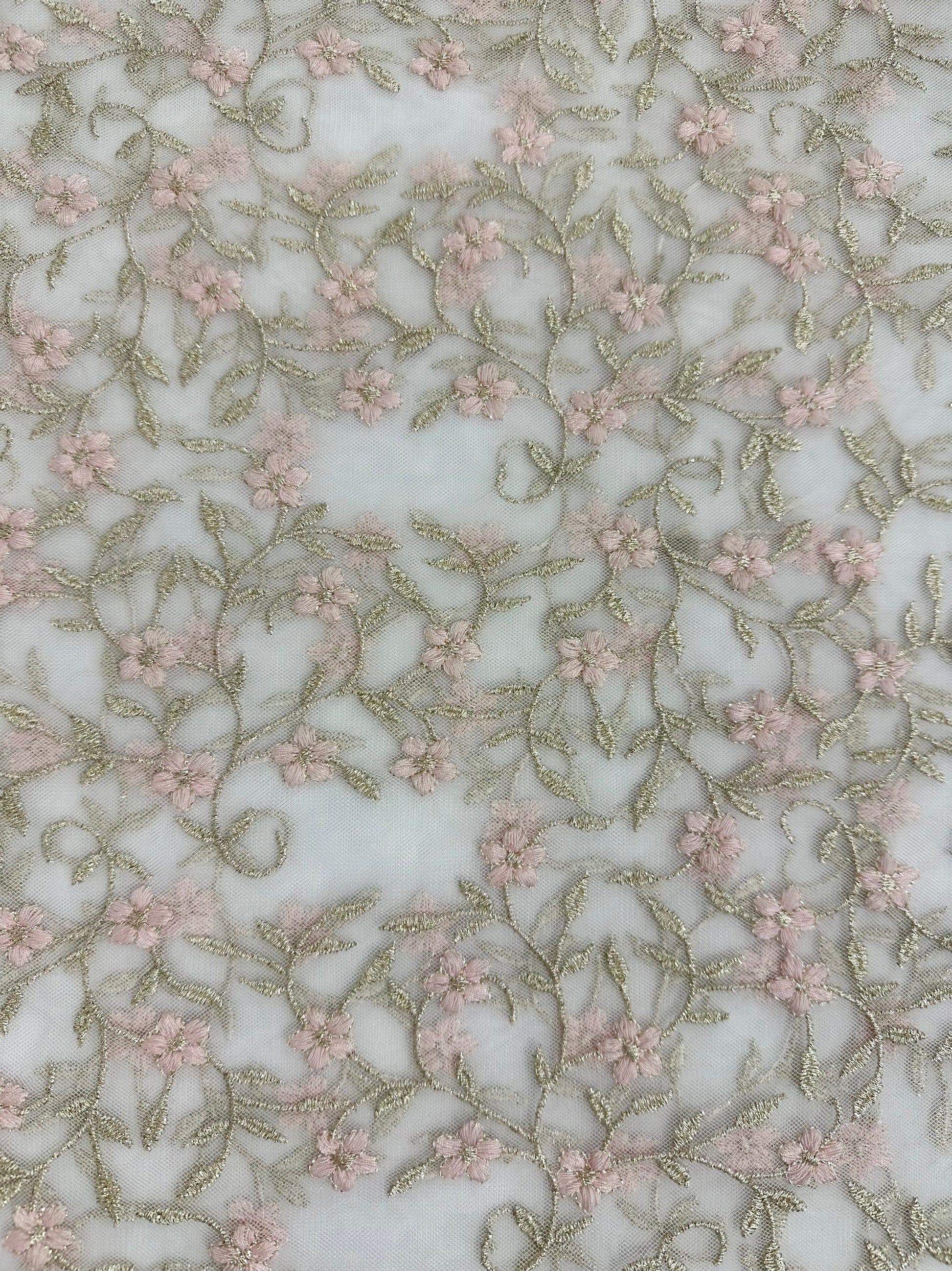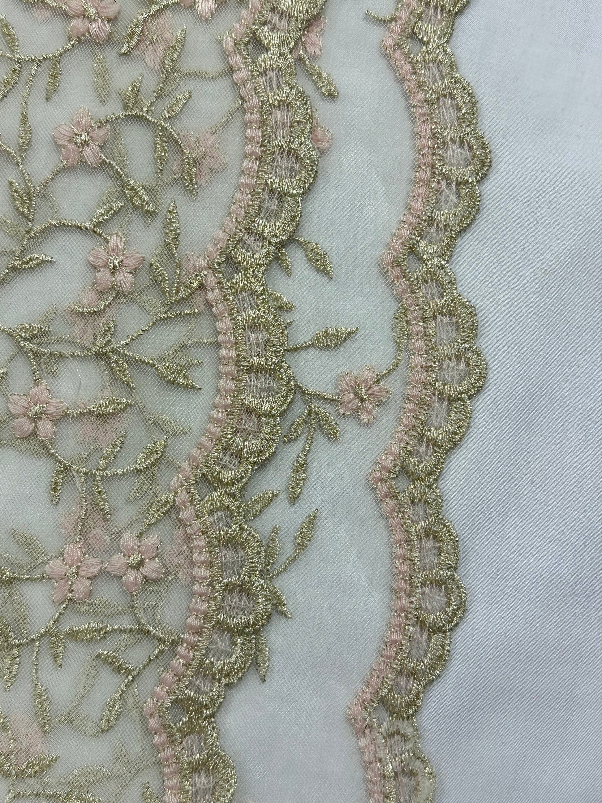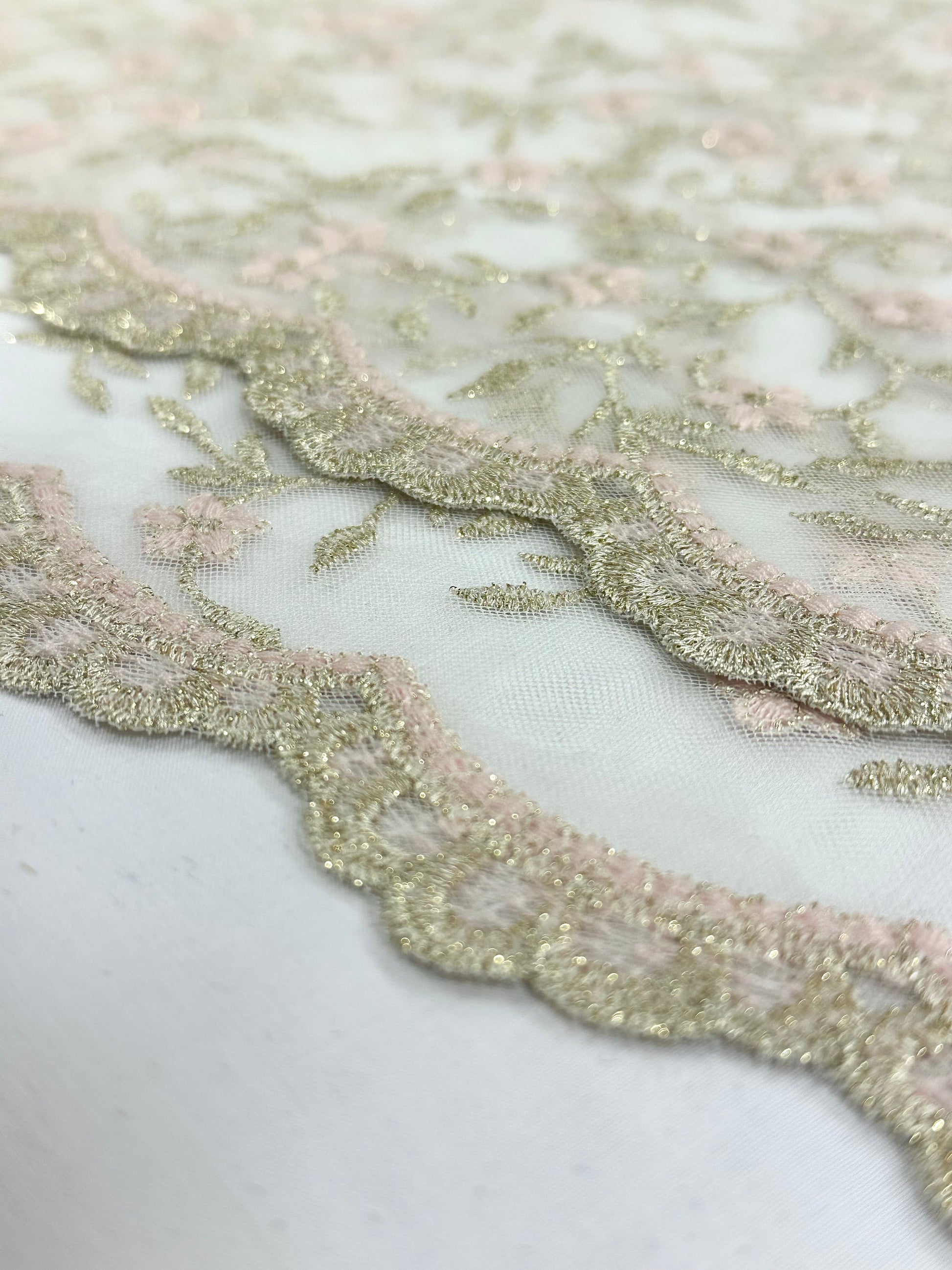 Tyllipohjainen, brodeerattu valkoinen pitsi. Tämän tyllin brodeeratut kuviot ovat hienostuneesti kiiltävää lurexia. Reunat piparkakku-kuvioituja. Kukat ovat vaaleanpunaiset.