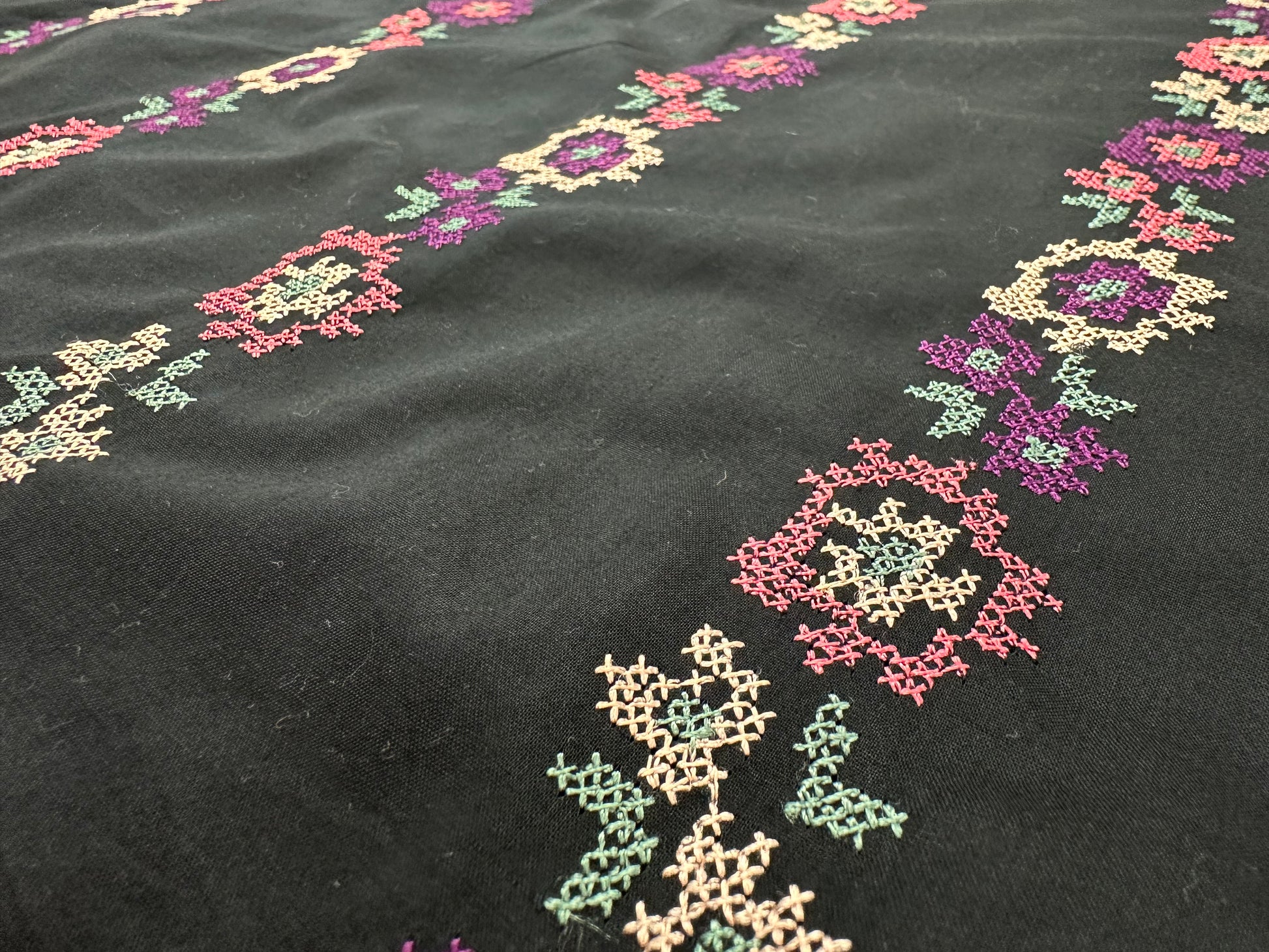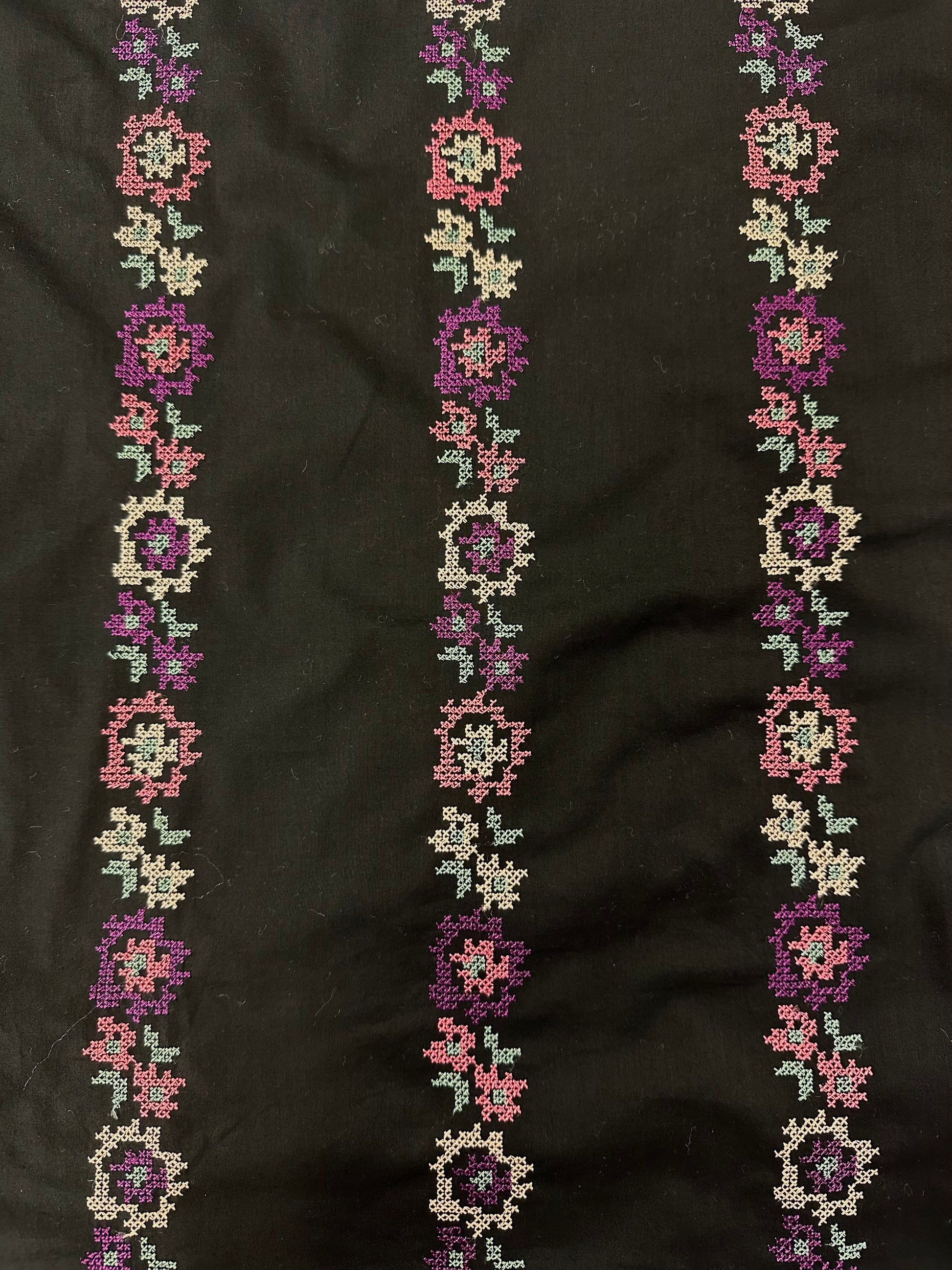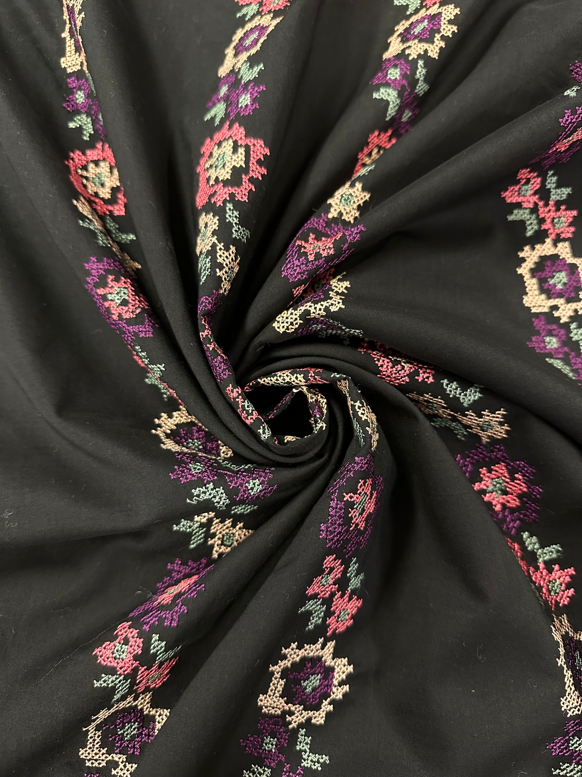 Tämä ohut puuvillakangas värikkäällä brodeerauksella on juuri täydellinen mekkoihin paitoihin ja muihin ihaniin kesävaatteisiin. Brodeeraus on tehty ristipistolla.