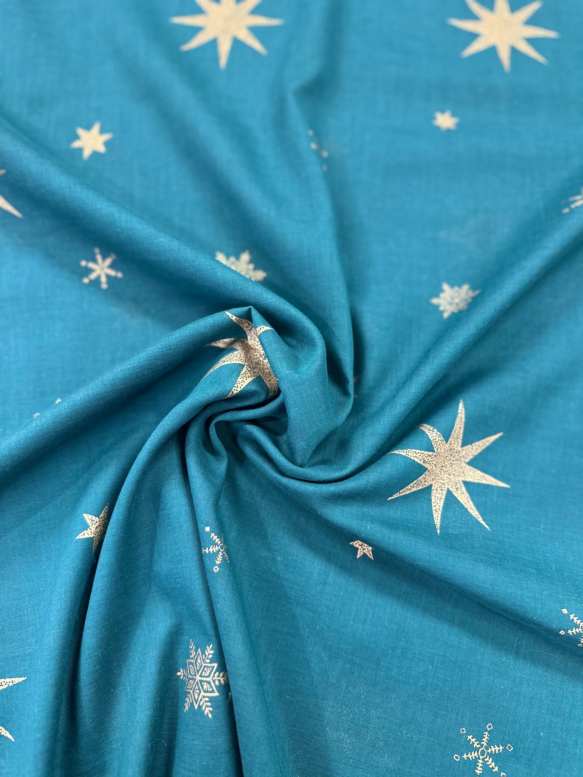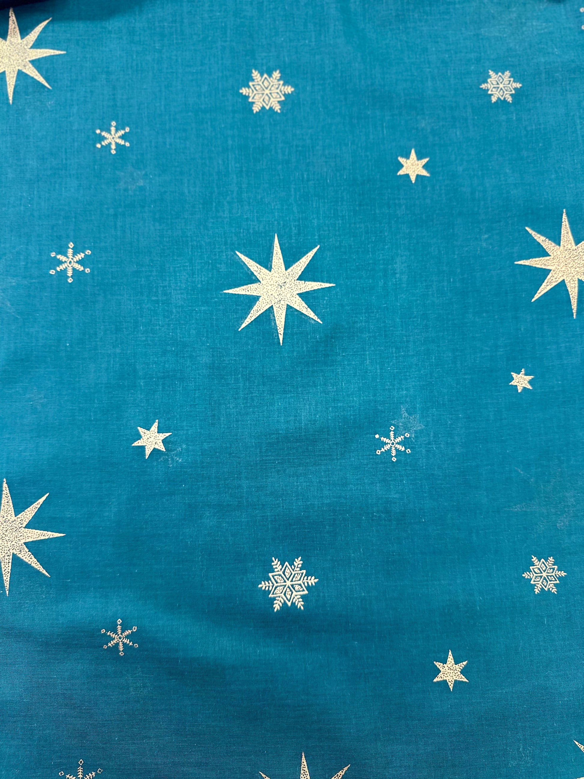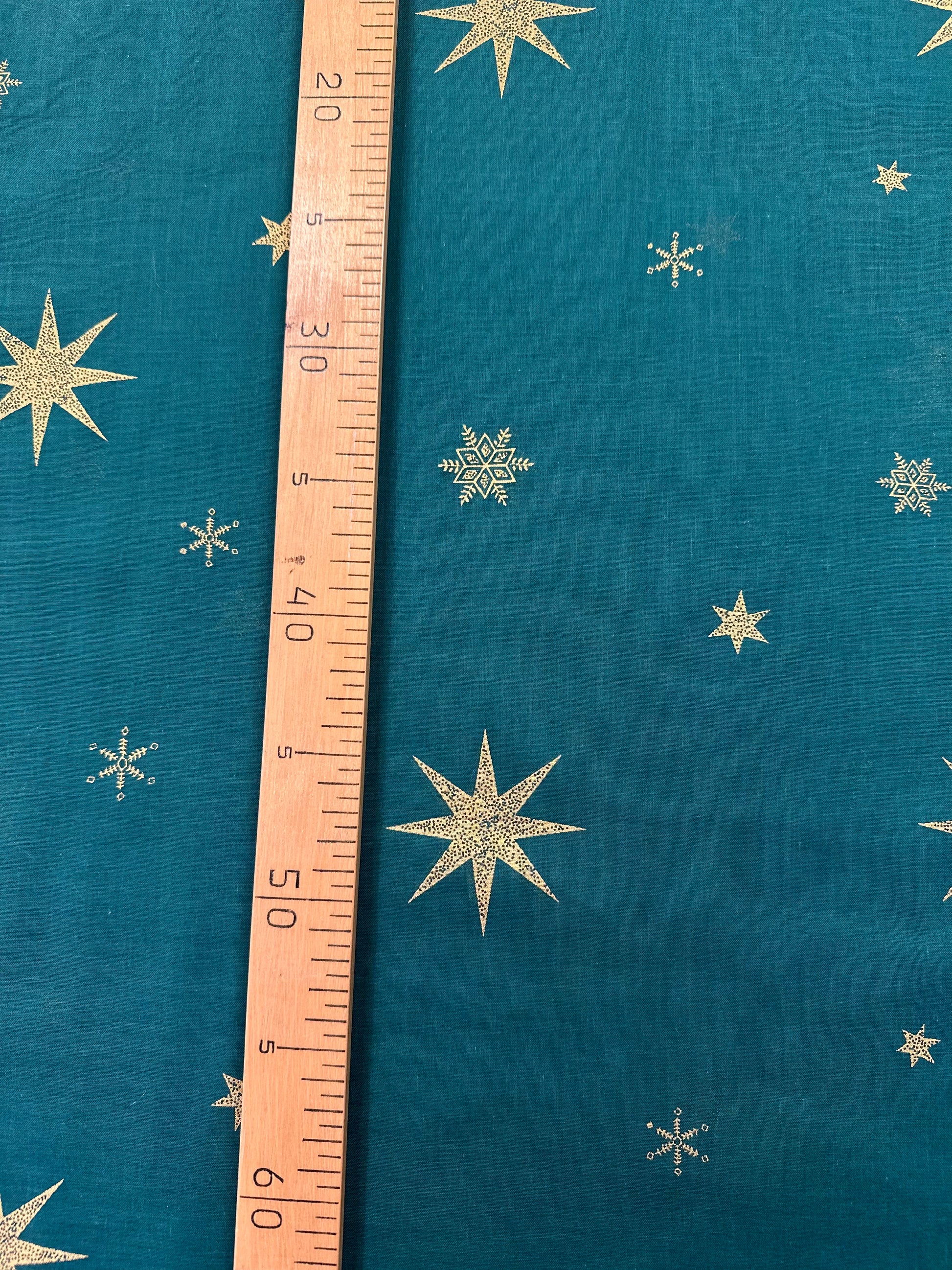 Tummanvihreä puuvillamusliini, kullanvärinen painatus. Väri on todellisuudessa tumma joulunvihreä, näyttö vääristää väriä.