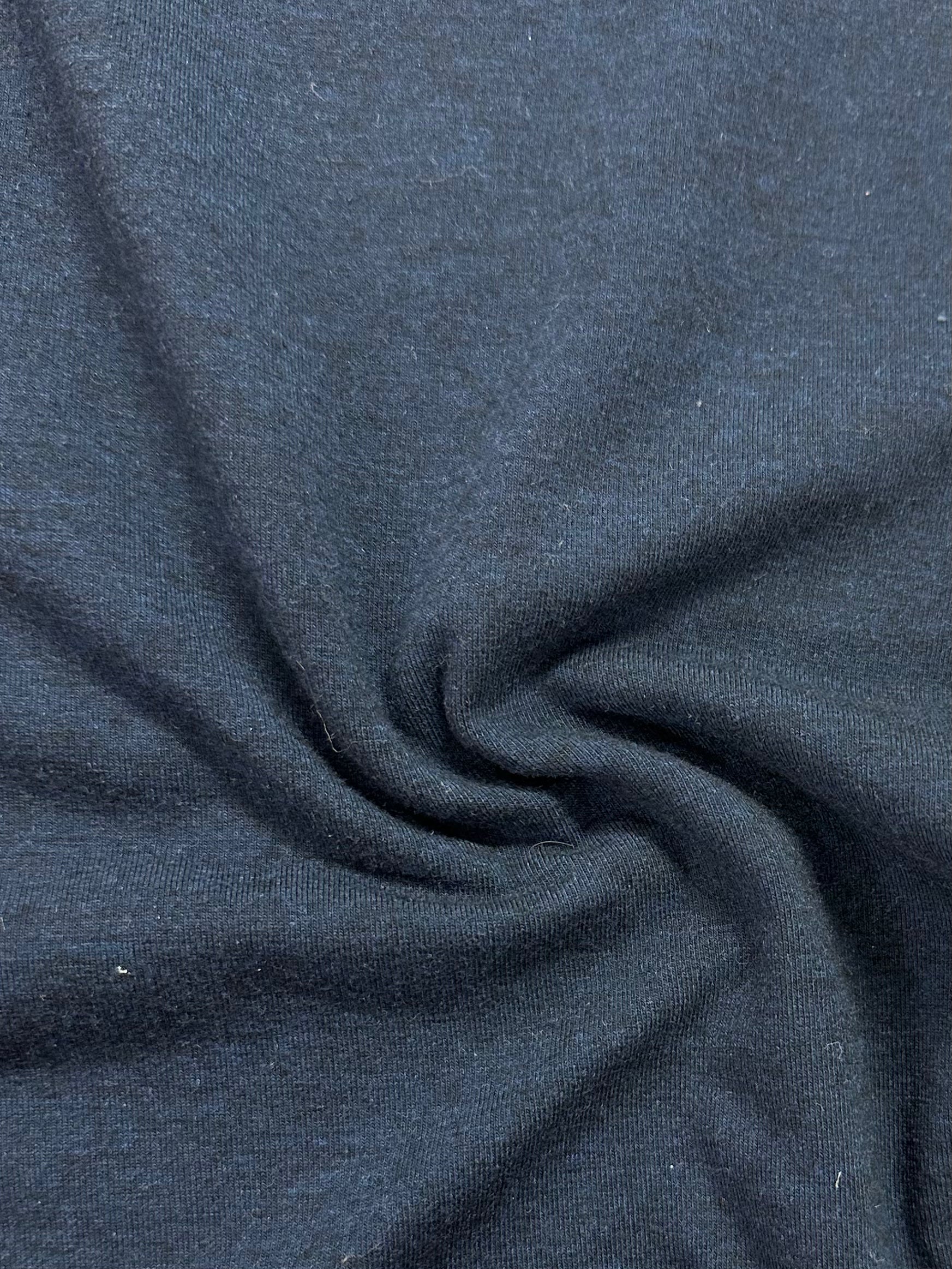 Pehmeä puuvillasekoite-jersey. Kankaan paksuus tekee sen, että se soveltuu erinomaisesti vaikkapa t-paidoiksi, mekoiksi ja muuhun vastaavaan käyttöön. Meleerattu, musta-sininen pinta.