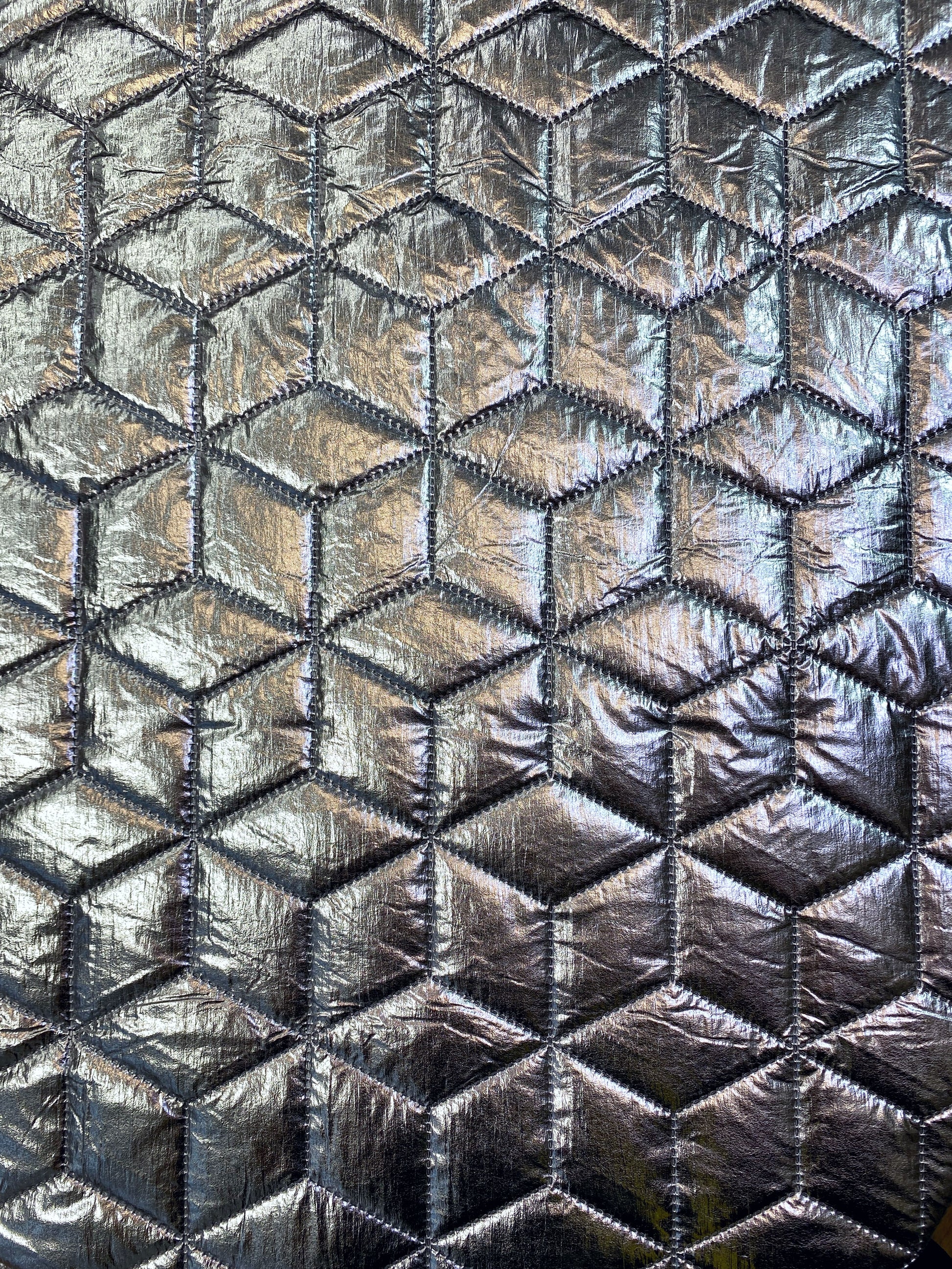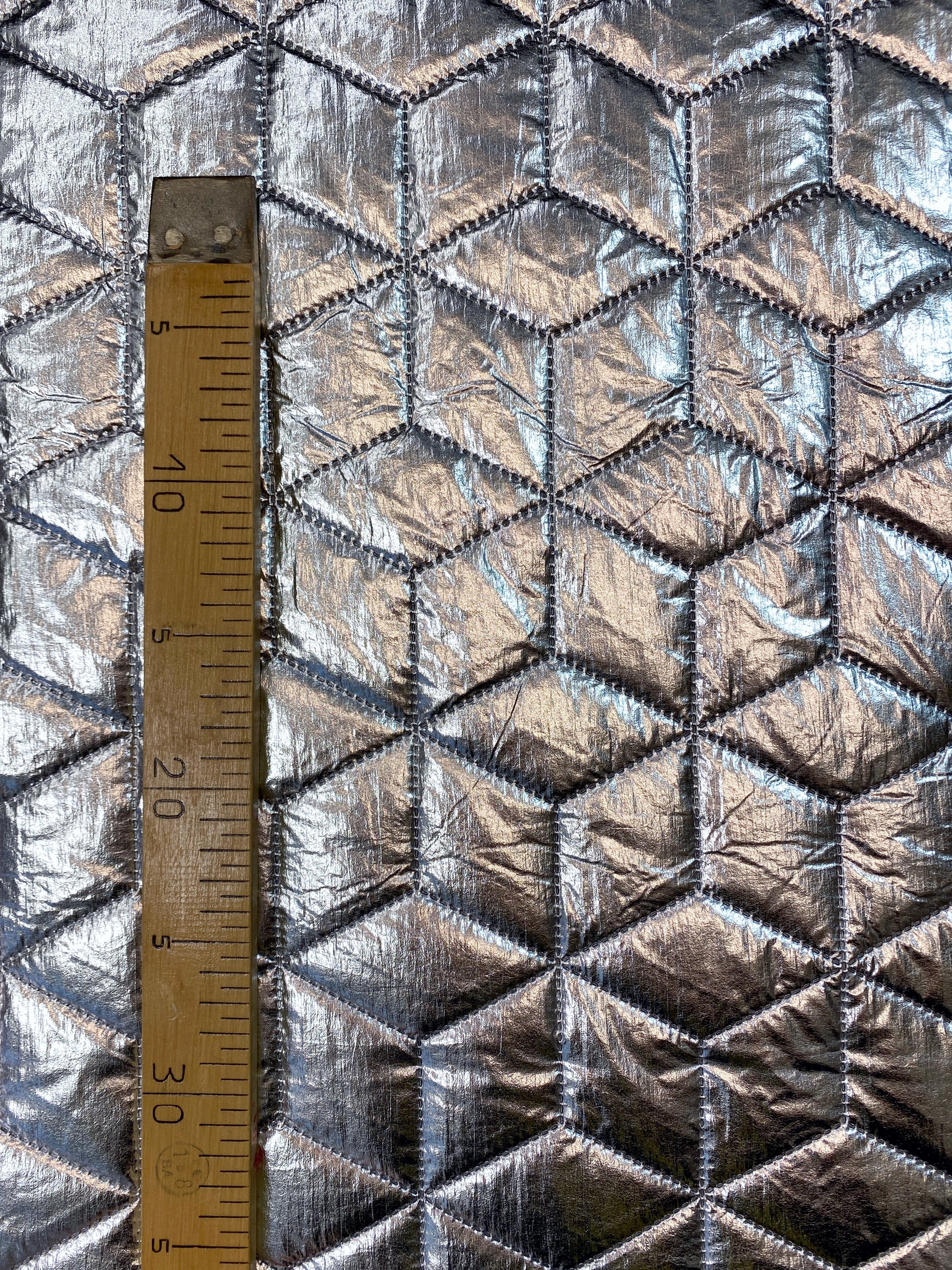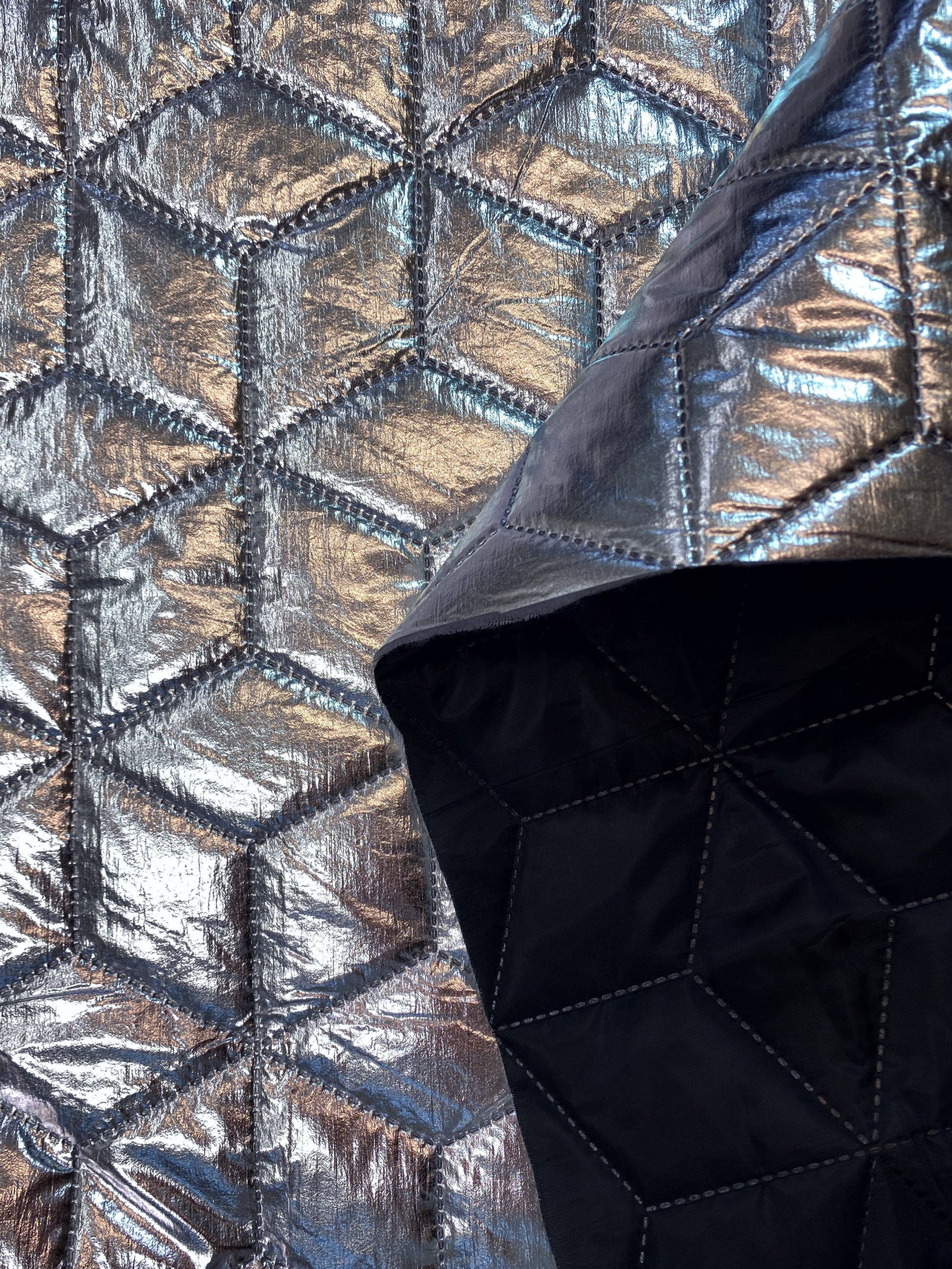 SILVER- tikkikangas on kaksipuoleinen. Sen ulkopuolella on hopea kangas, välissä ohut vanu ja sisäpuolella musta kangas. Jos haluat tehdä kevytuntuvatakin, niin tästä saat tehtyä sellaisen. Voit huolitella kankaan saumanvarat sisäpuolella vinonauhalla ja käyttää kankaan takkiin vuoritta.