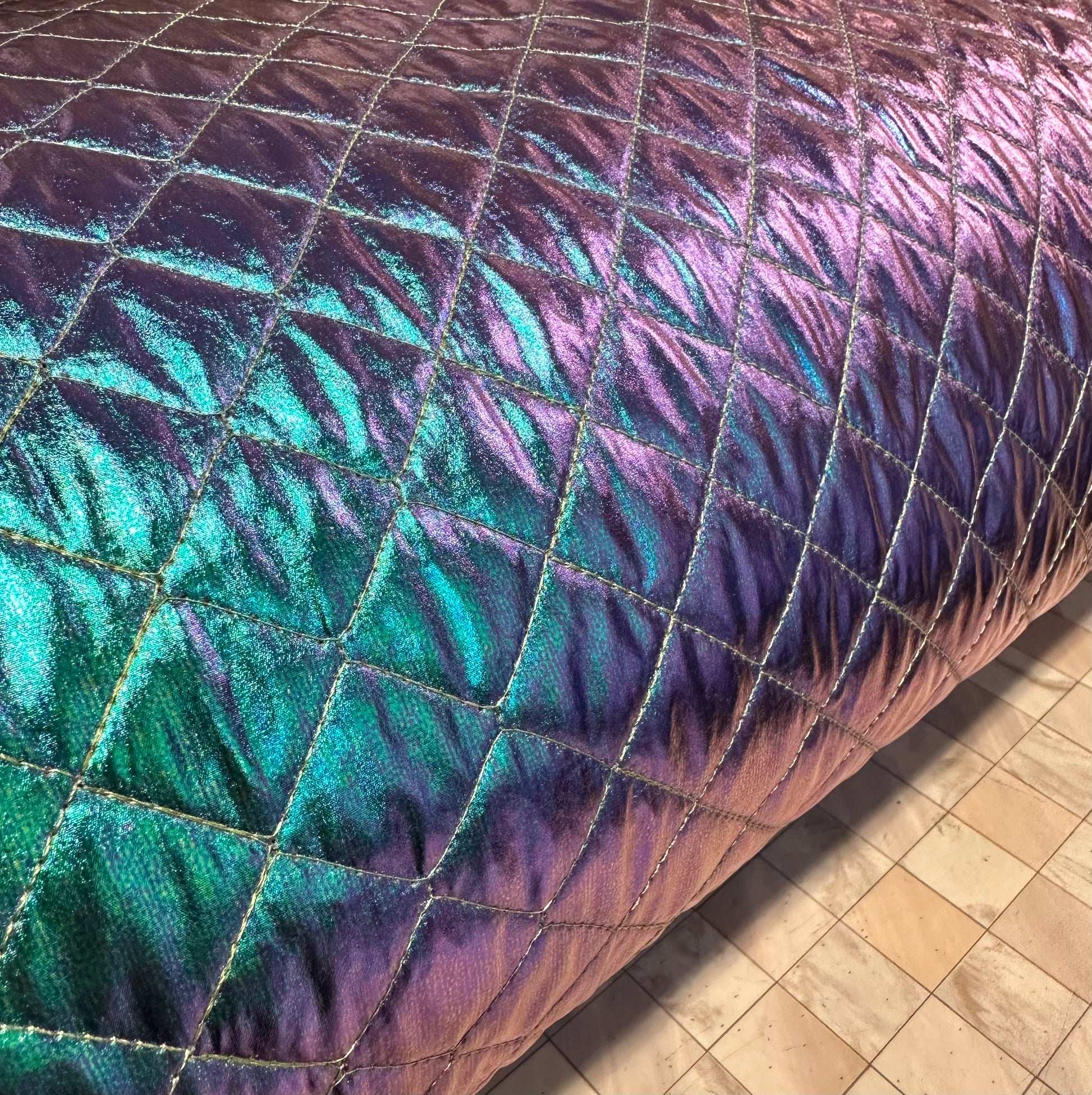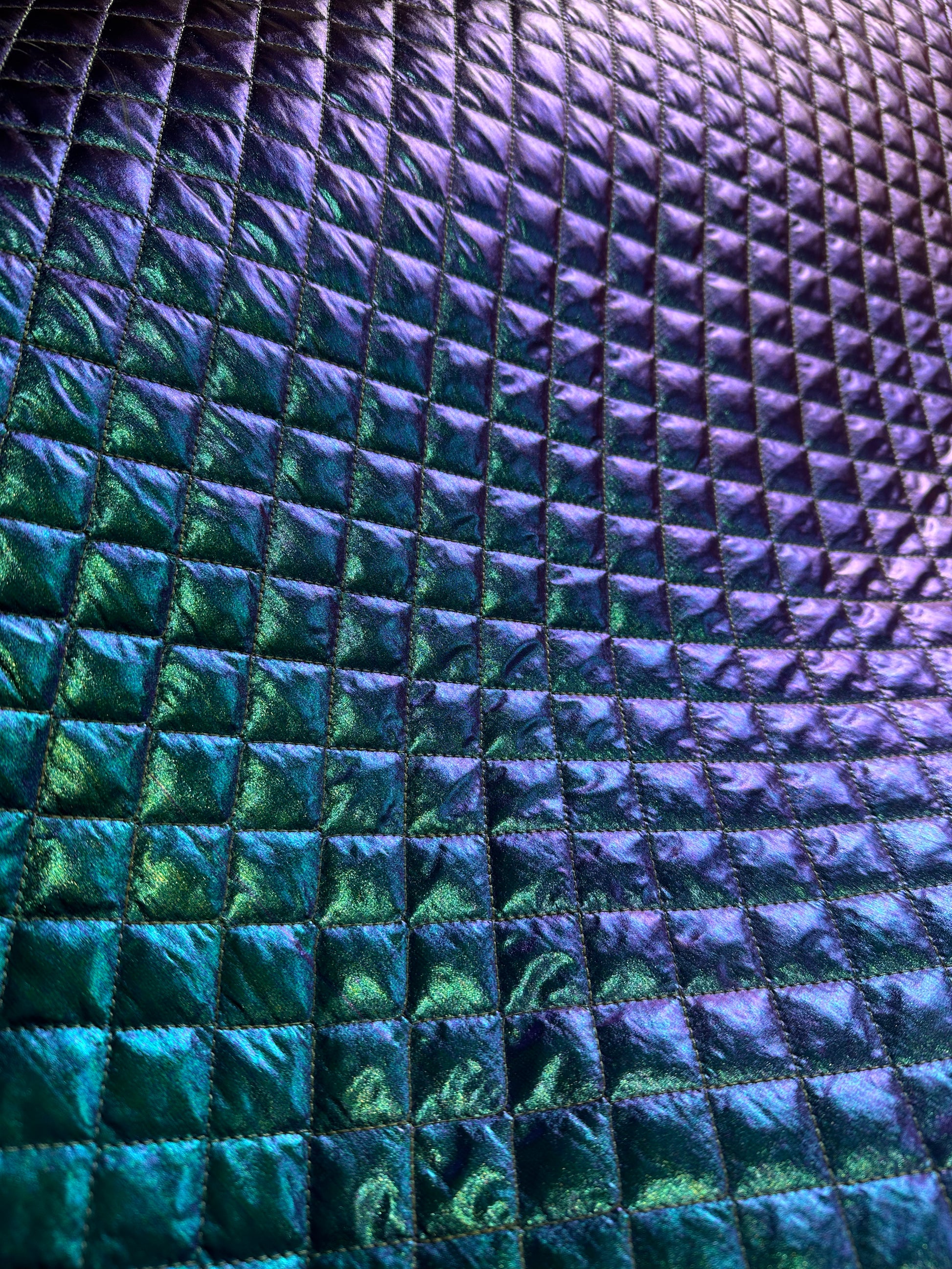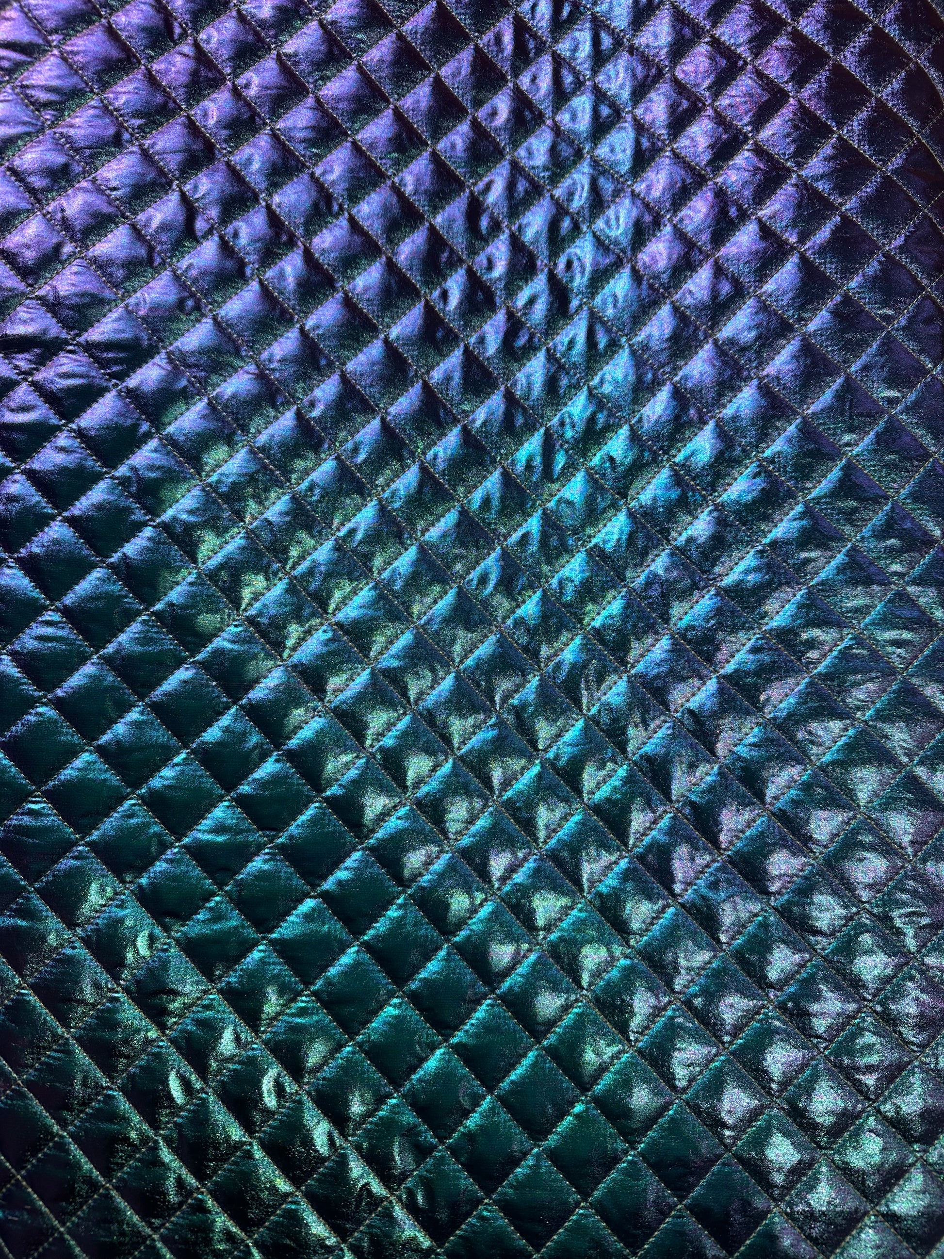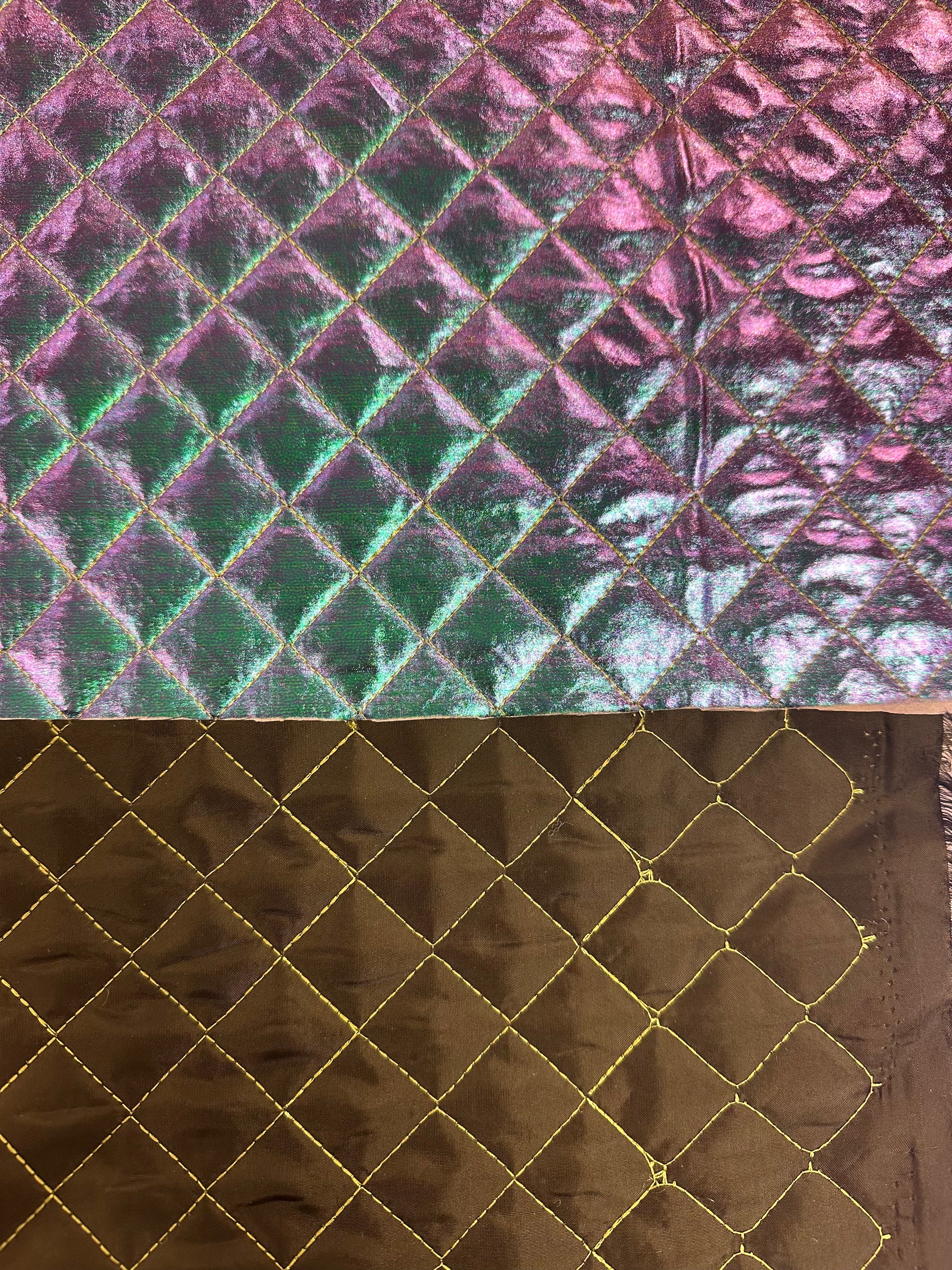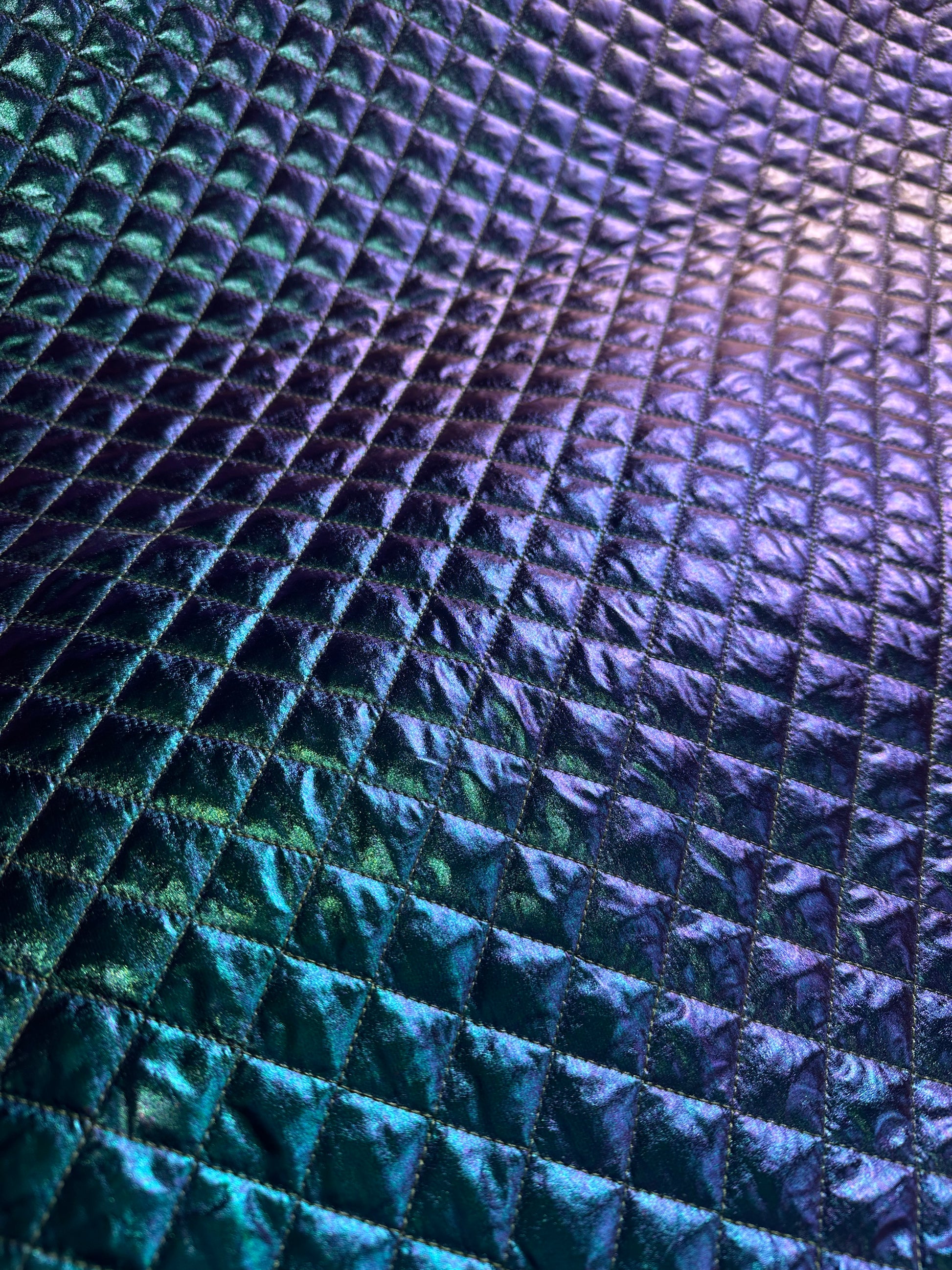 Tämä upea metallinhohtoinen tikkikangas soveltuu vaatetukseen sekä sisustukseen. Sen väri vaihtelee kauniisti valaistuksesta riipuen pinkistä turkoosiin. Kankaassa on myös musta vuori. Neliöiden koko on 2cm x 2cm.