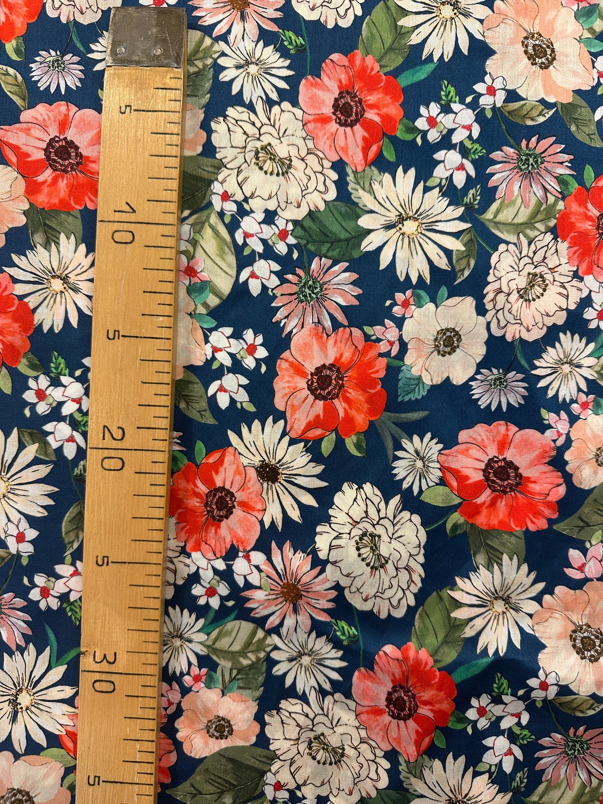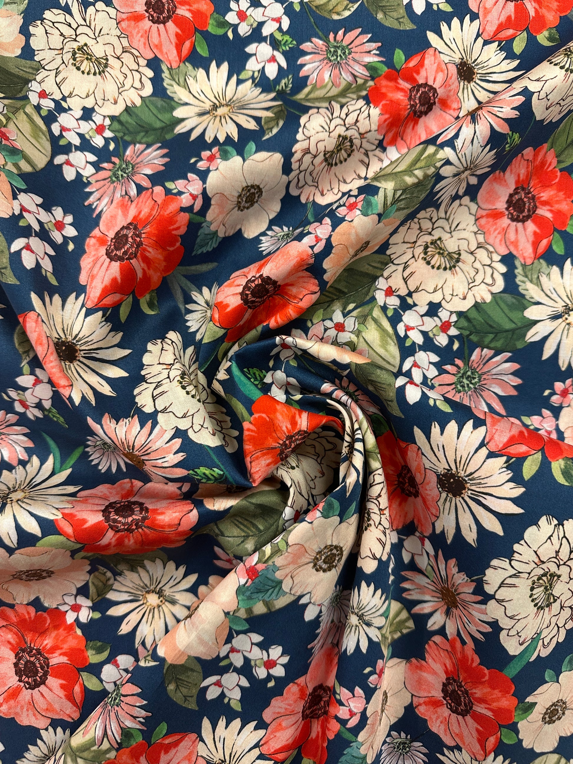 Kankaan pohja on keskisininen ja kukat tummanvihreät.
