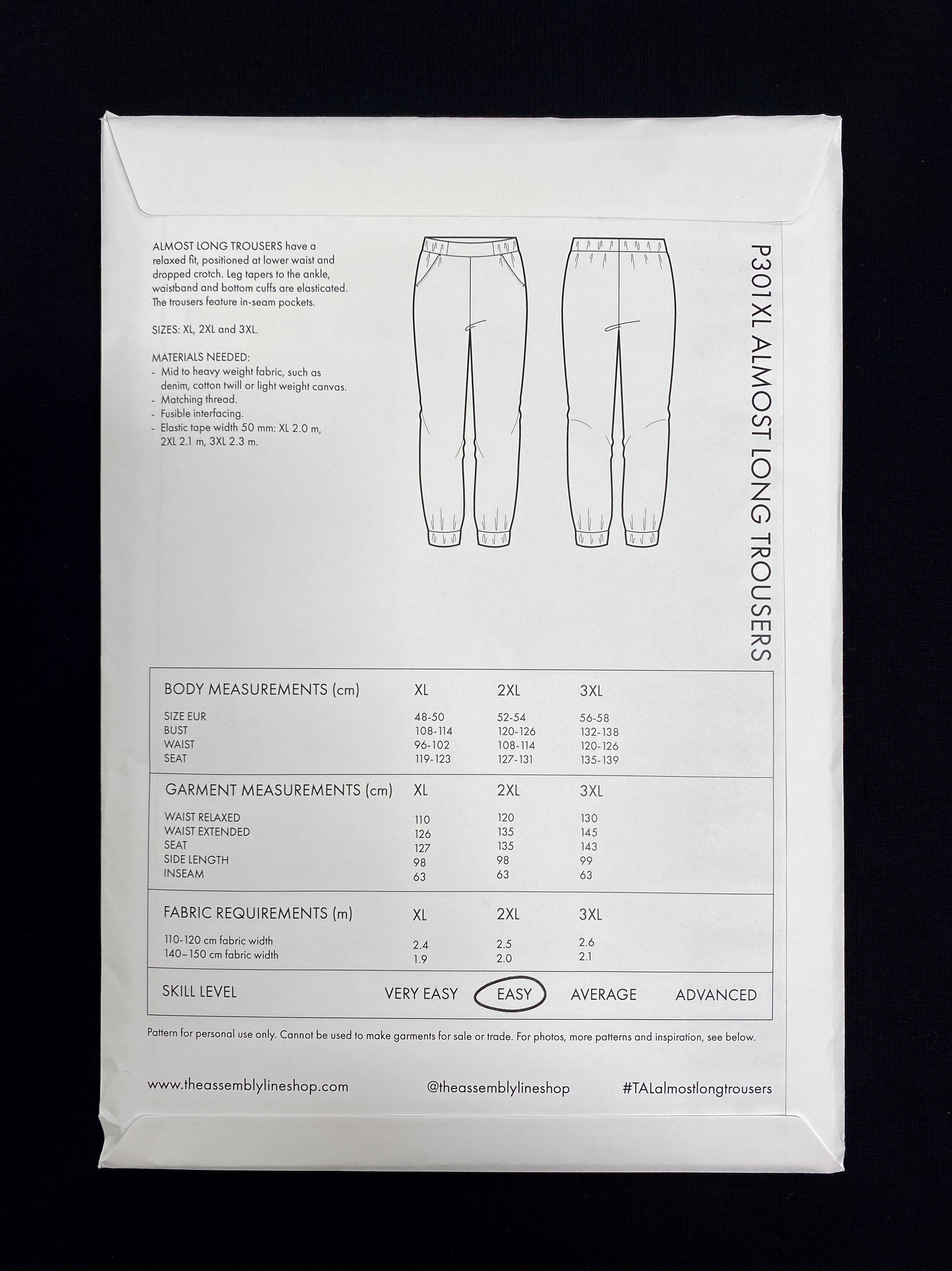 The Assembly Linen Almost Long Trousers. Housut ovat helpot. Yhdessä koko lajitelmassa on koot XS- S- M- L ja toisessa XL- 2XL- 3XL.