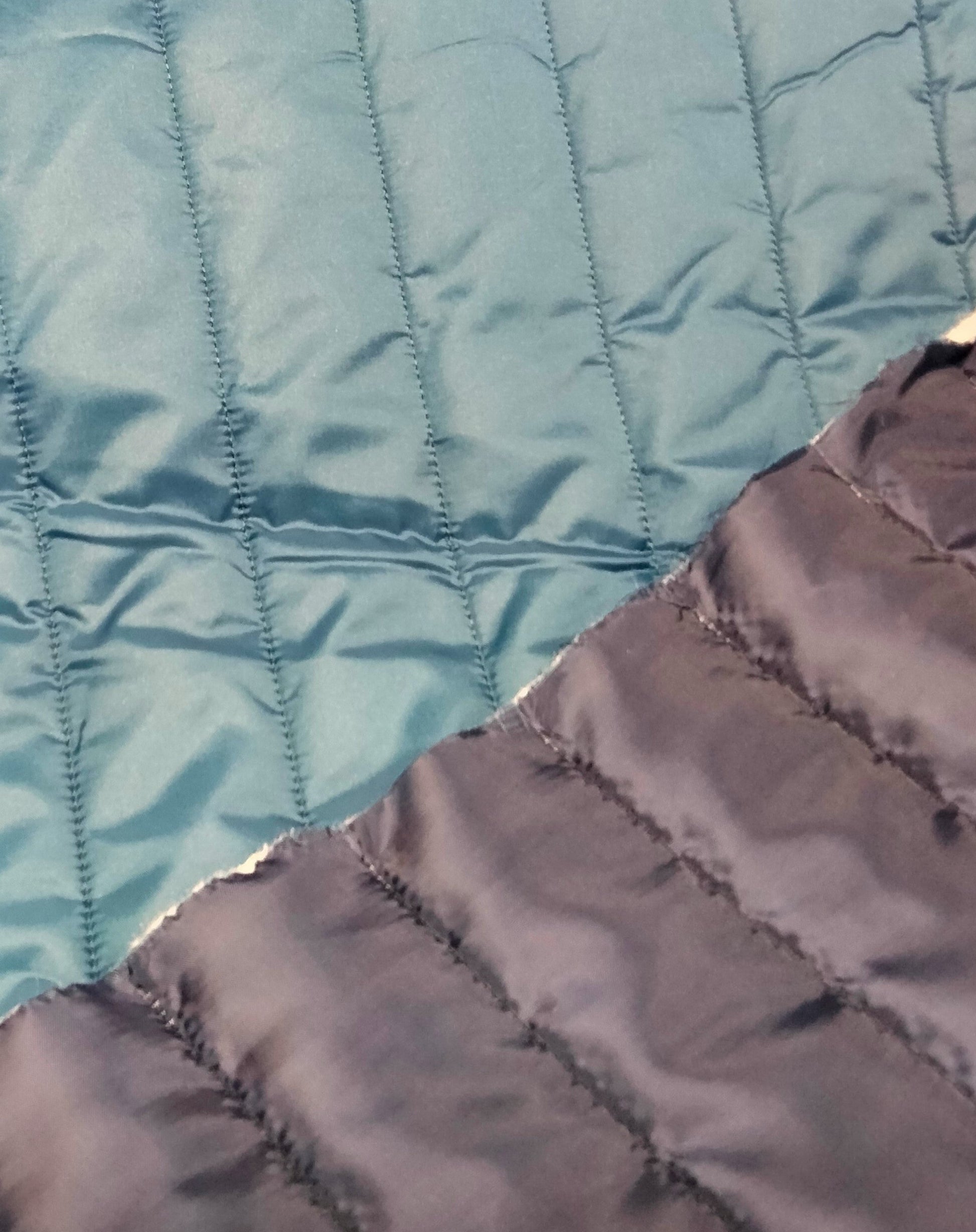 Toppakankaan oikea puoli (päällimmäinen kangas) on Monclerin vettähylkivä ulkoilukangas. Toisella puolella on erivärinen vuorikangas. Kangas on läpitikattu kokonaisuudessaan ja sen sisällä on pehmeä vanu.